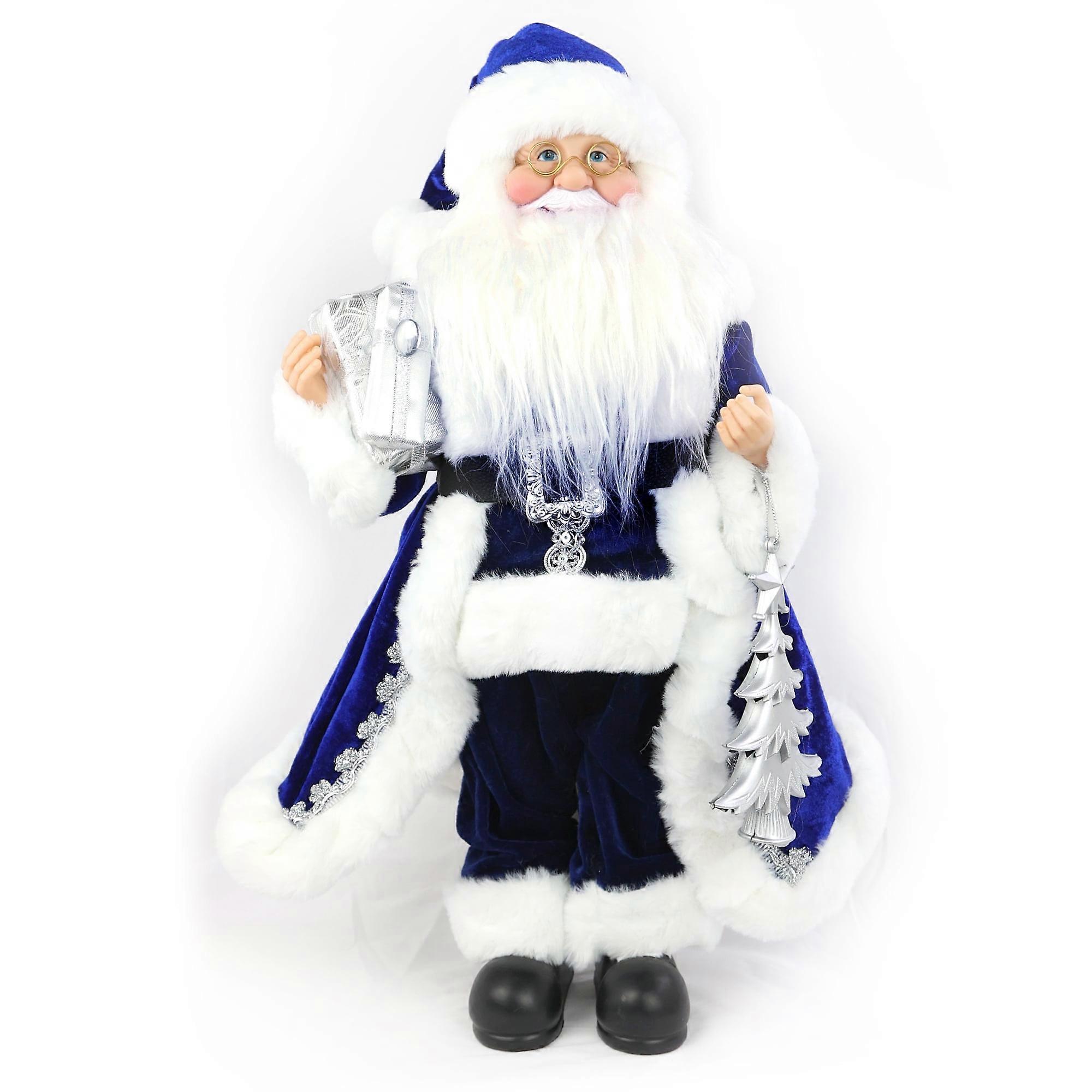 18” Lifelike Santa Figurine with Blue Velour Robe & Cap, Silver Accents, Holding Gifts – Posable Cap, Detailed Holiday Decor
