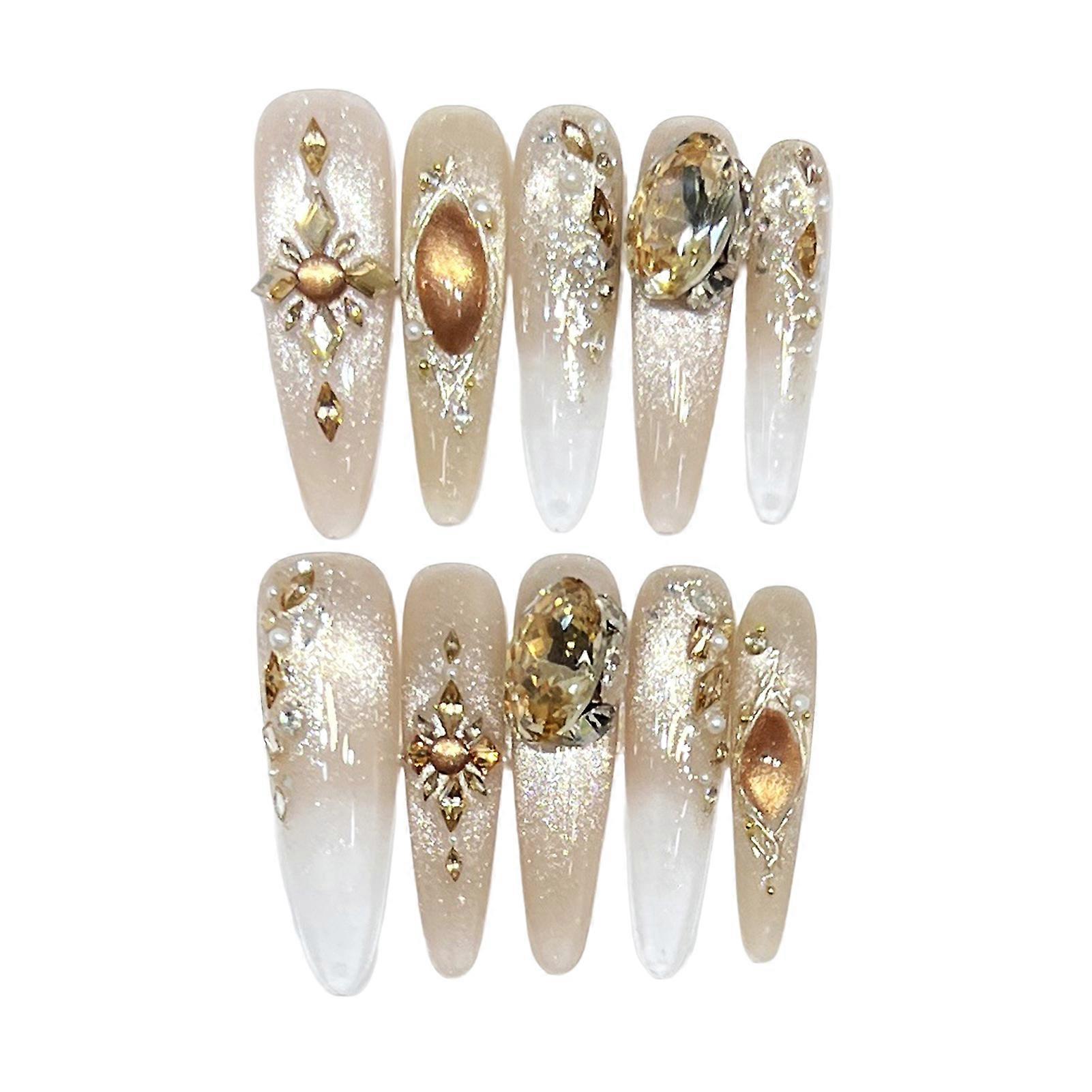 10PCS Champagne Press On Nails with Flash Glitter and Rhinestones Decor False