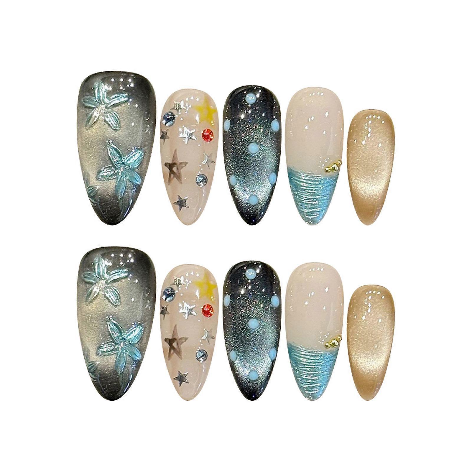10Pcs Almond Press On Nails in Hazelnut Brown with Cat Eye Laser Effect Sea Salt