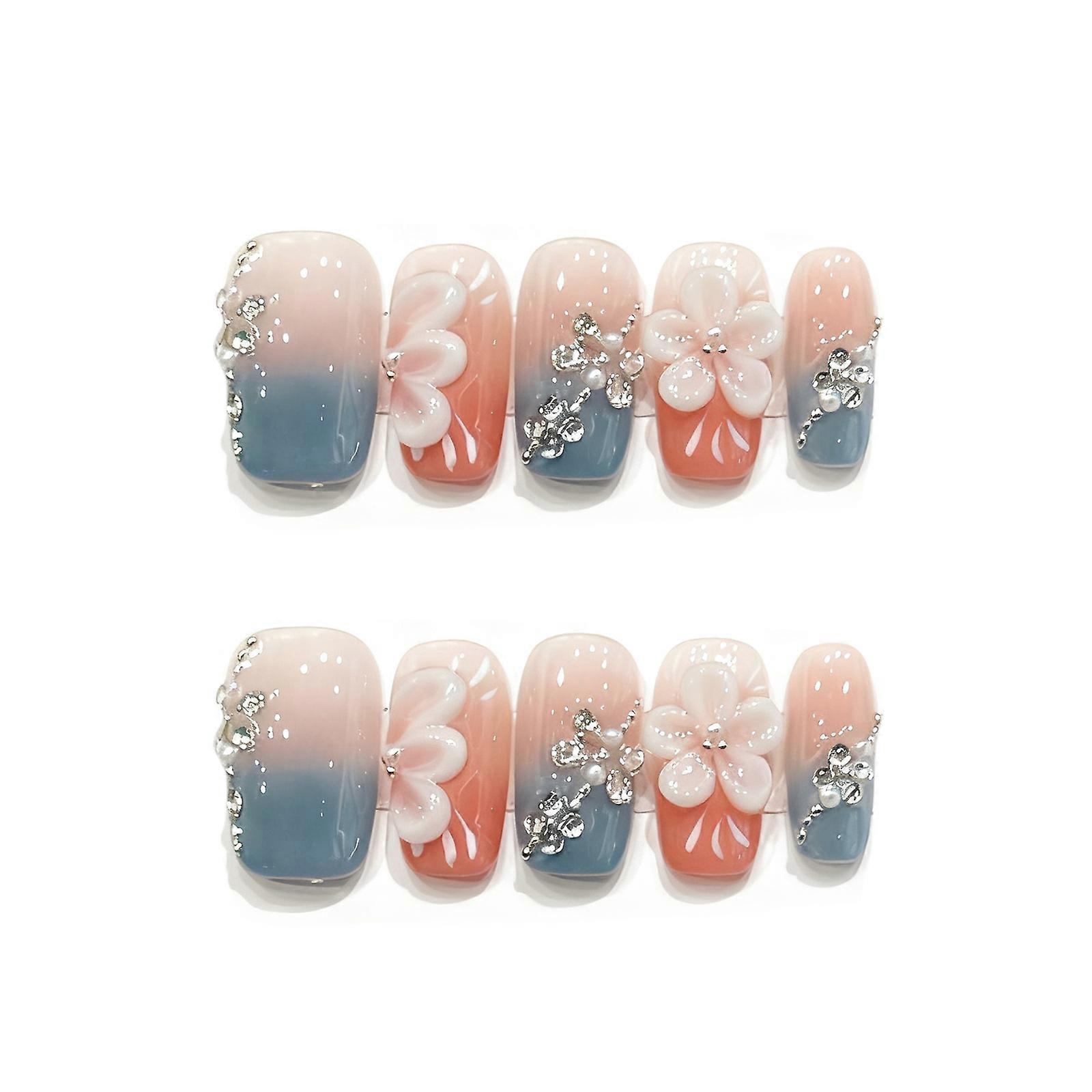 10Pcs Artificial Nails Ombre Fingernails with Hand-Cut Floral Design and