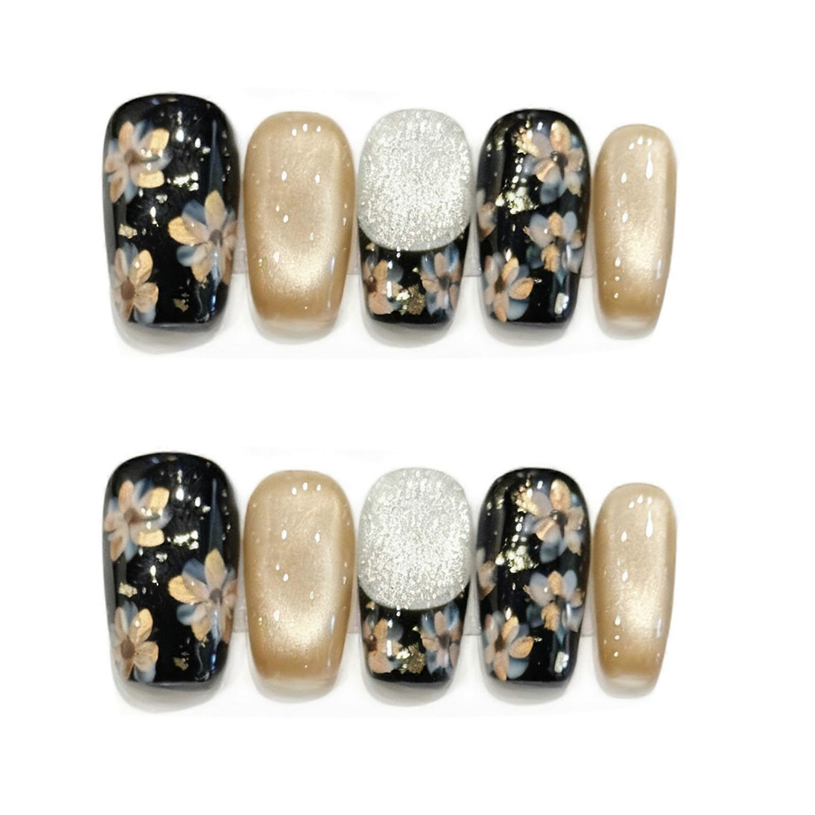 10Pcs Fake Nails Retro Flower Nail Art Tips With Glitter Design Hand Painted