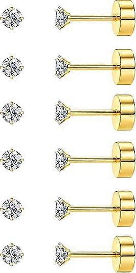 Cterwk 6 Pairs 14K Gold Plated Flat Back Earrings Stainless Steel Stud Earrings Set Cubic Zirconia Earring Piercing Jewelry for Women Men, Gold, 2MM