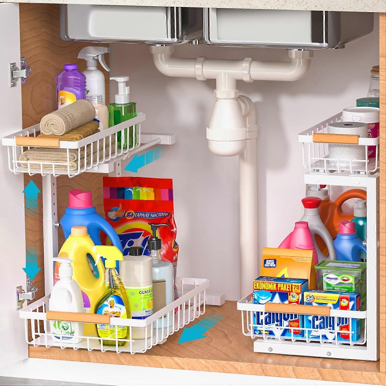 Under Sink Organizer 2 Pack, 2-Tier Slide-Out Storage, Adjustable Height Pull-Out Drawers for Kitchen Bathroom, Metal Shelves, White