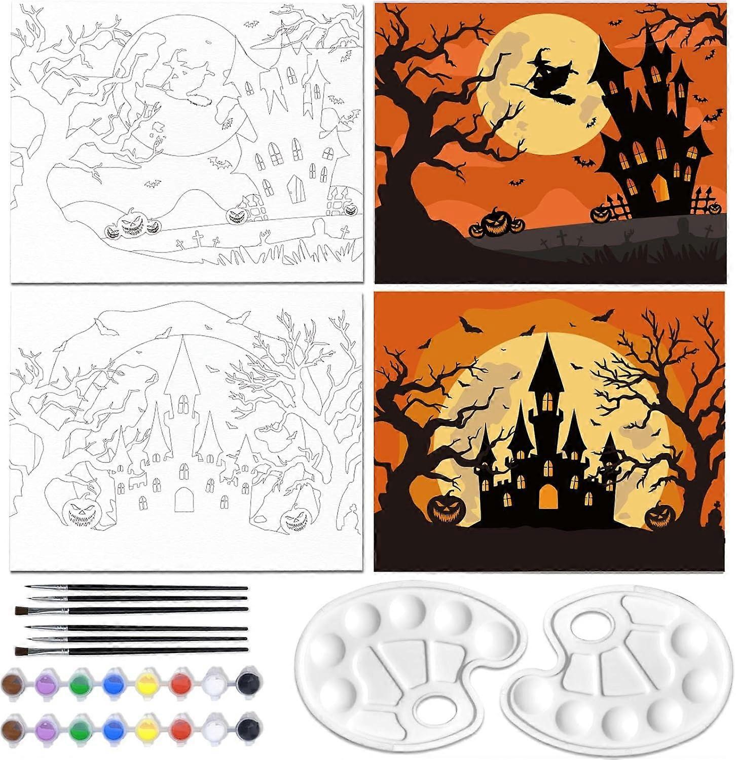 2 Pack 8x10in Pre-Printed Halloween Canvas Painting Kits, Haunted Houses & Pumpkins, Gothic Holiday Wall Decor Gifts, 20x25cm