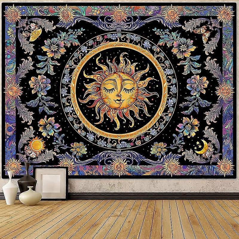 Yellow Sun Moon Tapestry Vintage Boho Wall Hanging with Sunflowers Butterfly Moth Constellation Aesthetic for Bedroom Dorm Living Room (Orange, 36''