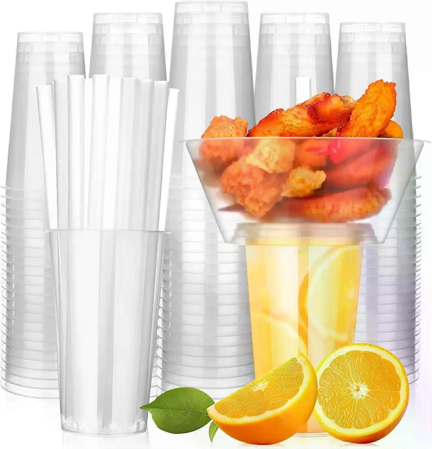 Drink and Snack Cup Straws Set Disposable Plastic Stadium Tumbler with Snack Bowl Cup Snack Holder for Fried Chicken Fruit