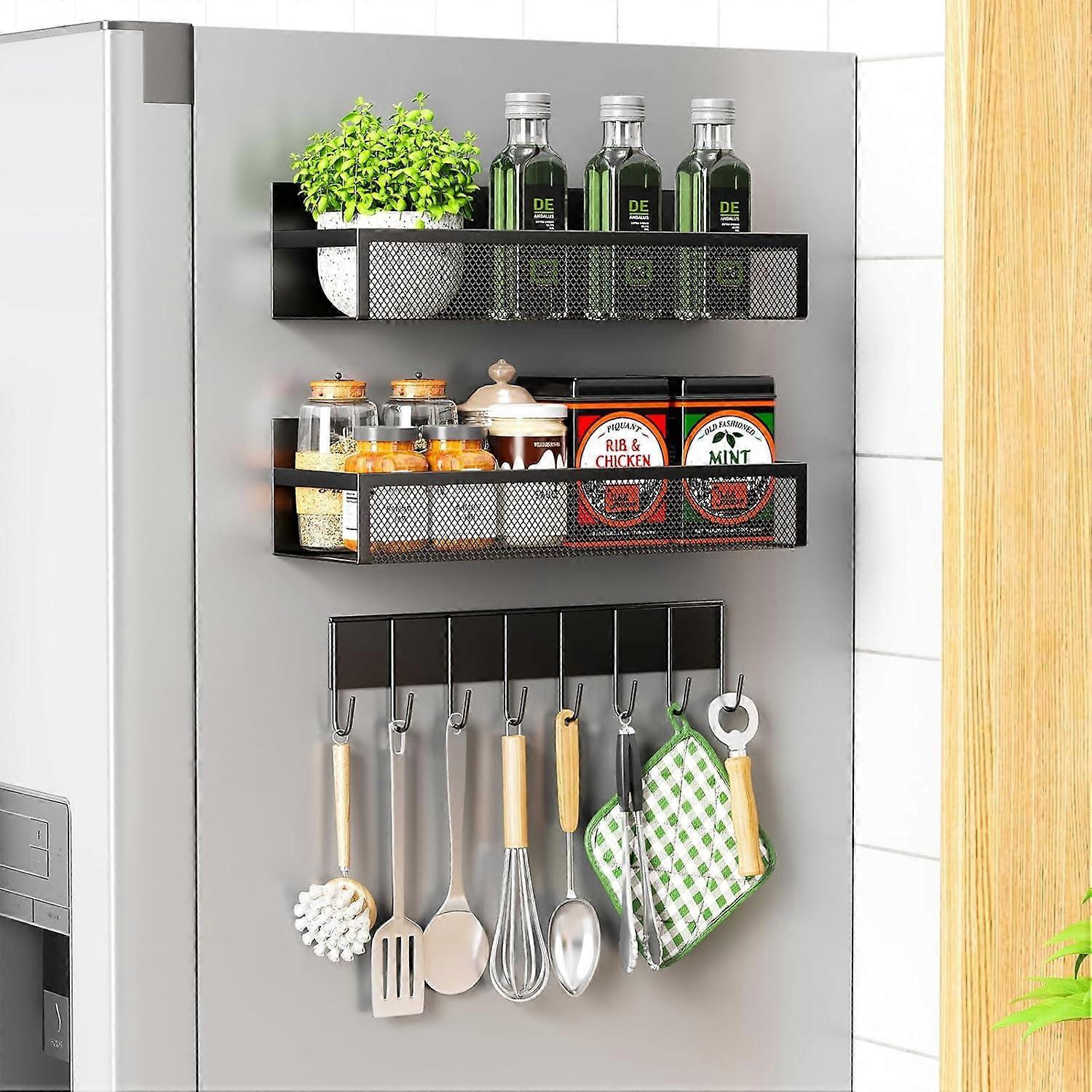 Magnetic Spice Rack for Fridge, 3 Pack with 8 Hooks, Movable Seasoning Organizer for Kitchen Storage, Black