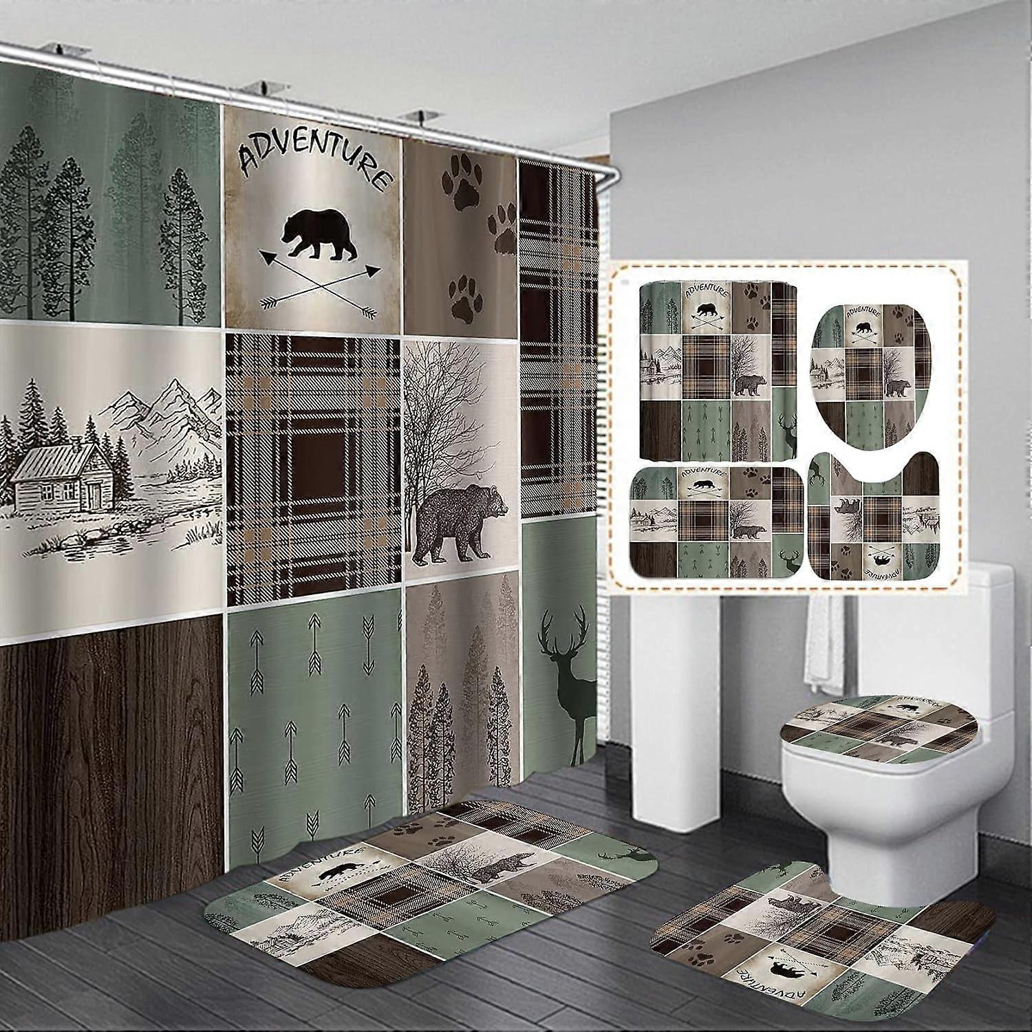 4PCS Deer Shower Curtain Set, Country Mountain Pine Tree Foggy Woodland Elk Birds Wildlife Animals Hunting Lake Cabin Rustic Farmhouse Bathroom