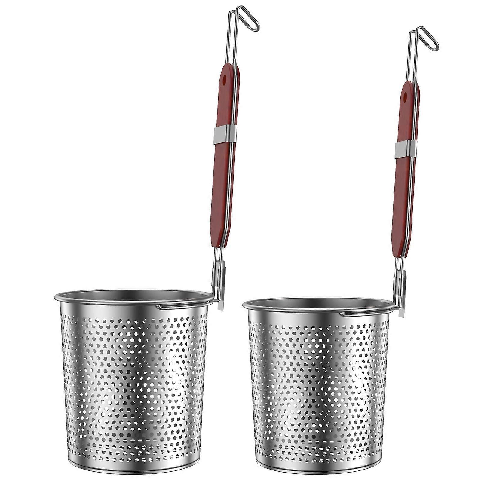 This mesh pasta basket features small holes with wooden handles, suitable for straining pasta, tortellini, ravioli, eggs and meatballs, you can also use it to blanch veggies or fruits, French fries, chicken nuggets, shrimp or fish for all your cooking needs.