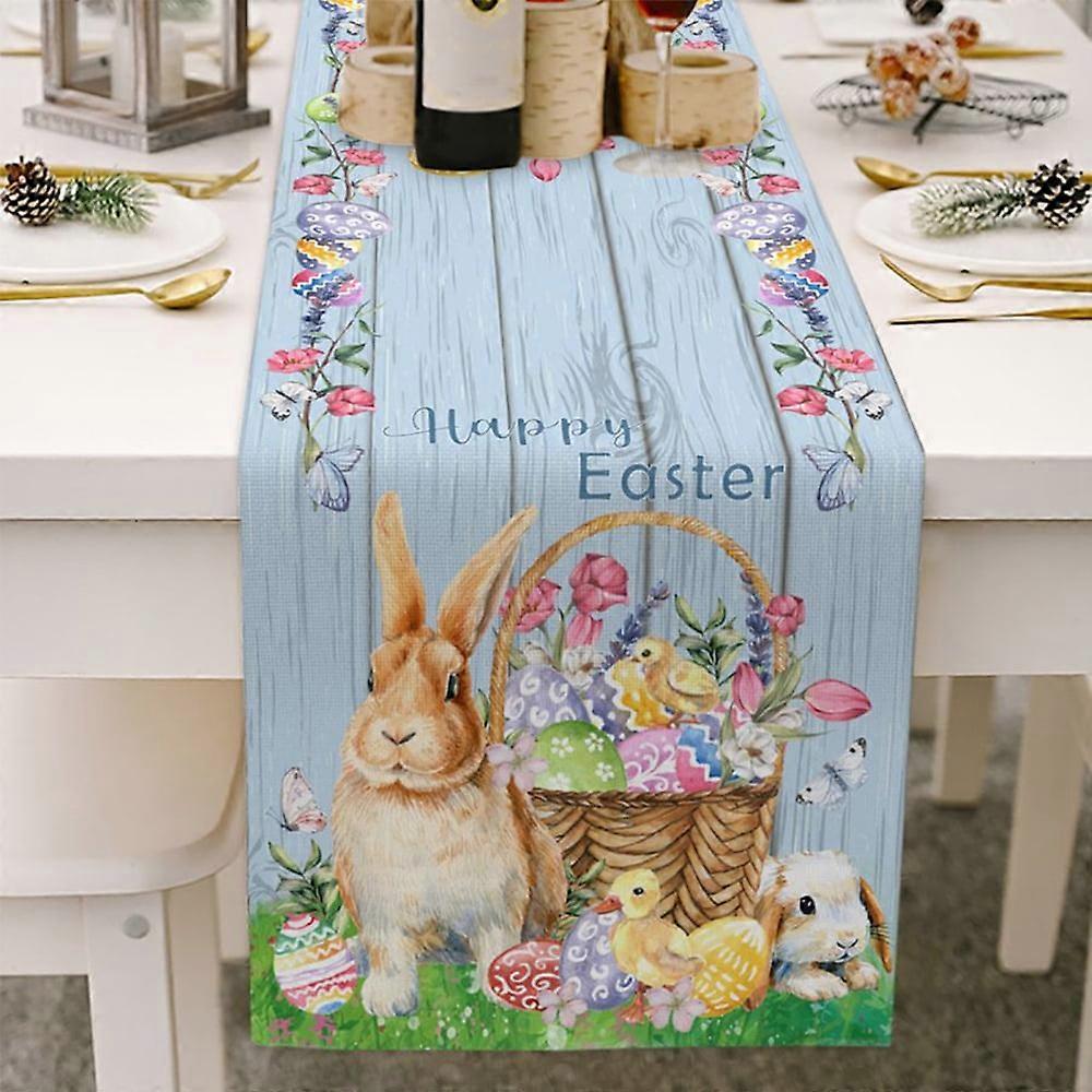 Happy Easter Table Runner 13x70in, Cotton Linen Bunny Tail Egg Farmhouse Decor, compatible with rustic spring party & holiday dinner home