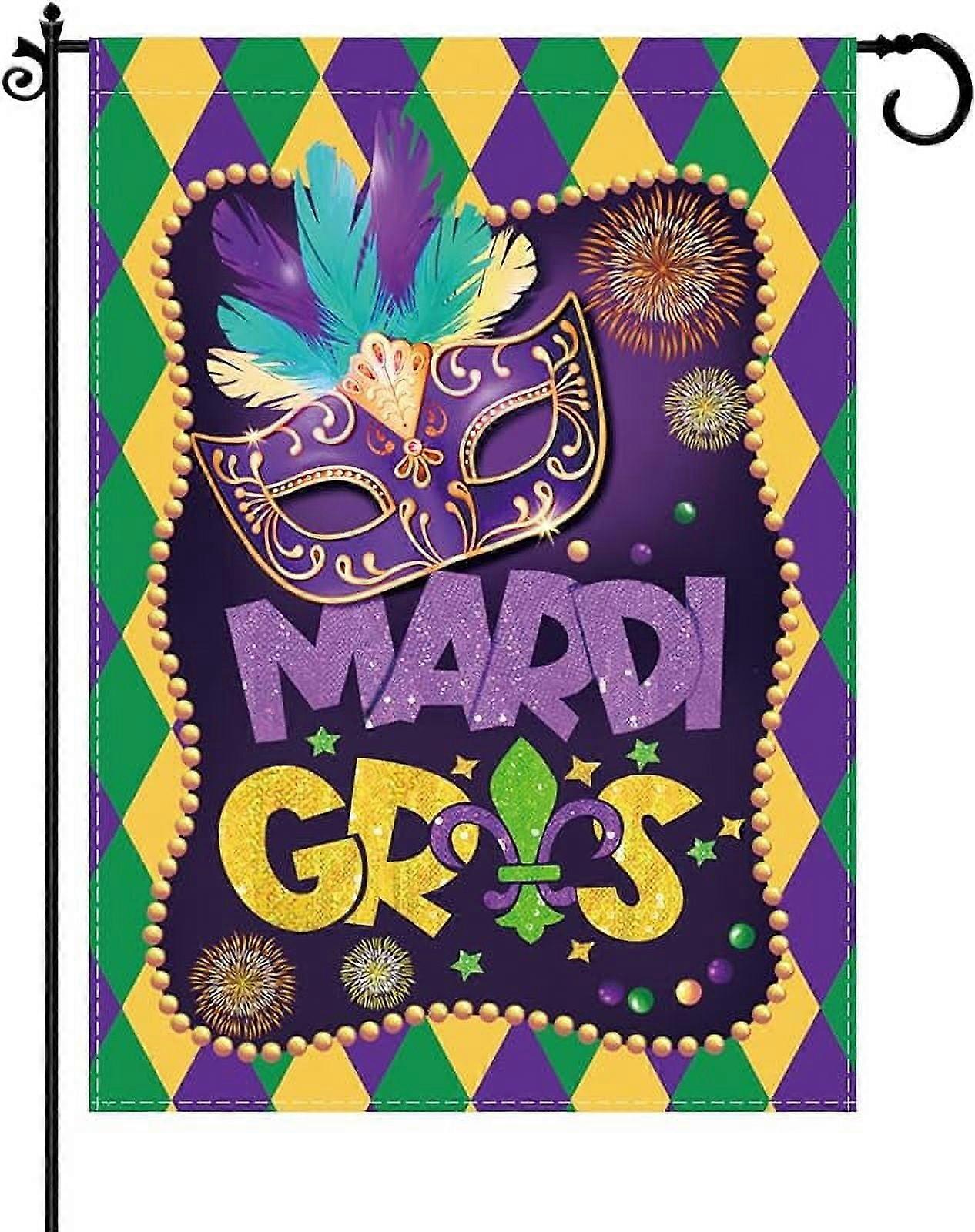 Mardi Gras Garden Flag - Fleur De Lis & Masquerade Mask, Double Sided Burlap, 12.5x18 Inch, Yard Decoration
