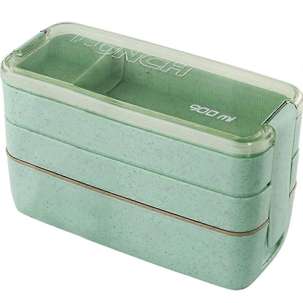 Wheat Straw Plastic Lunch Box 900ml, Leakproof Microwave Safe 3-Layer Bento, Green - Compatible with Begine, Includes Chopsticks & Spoon