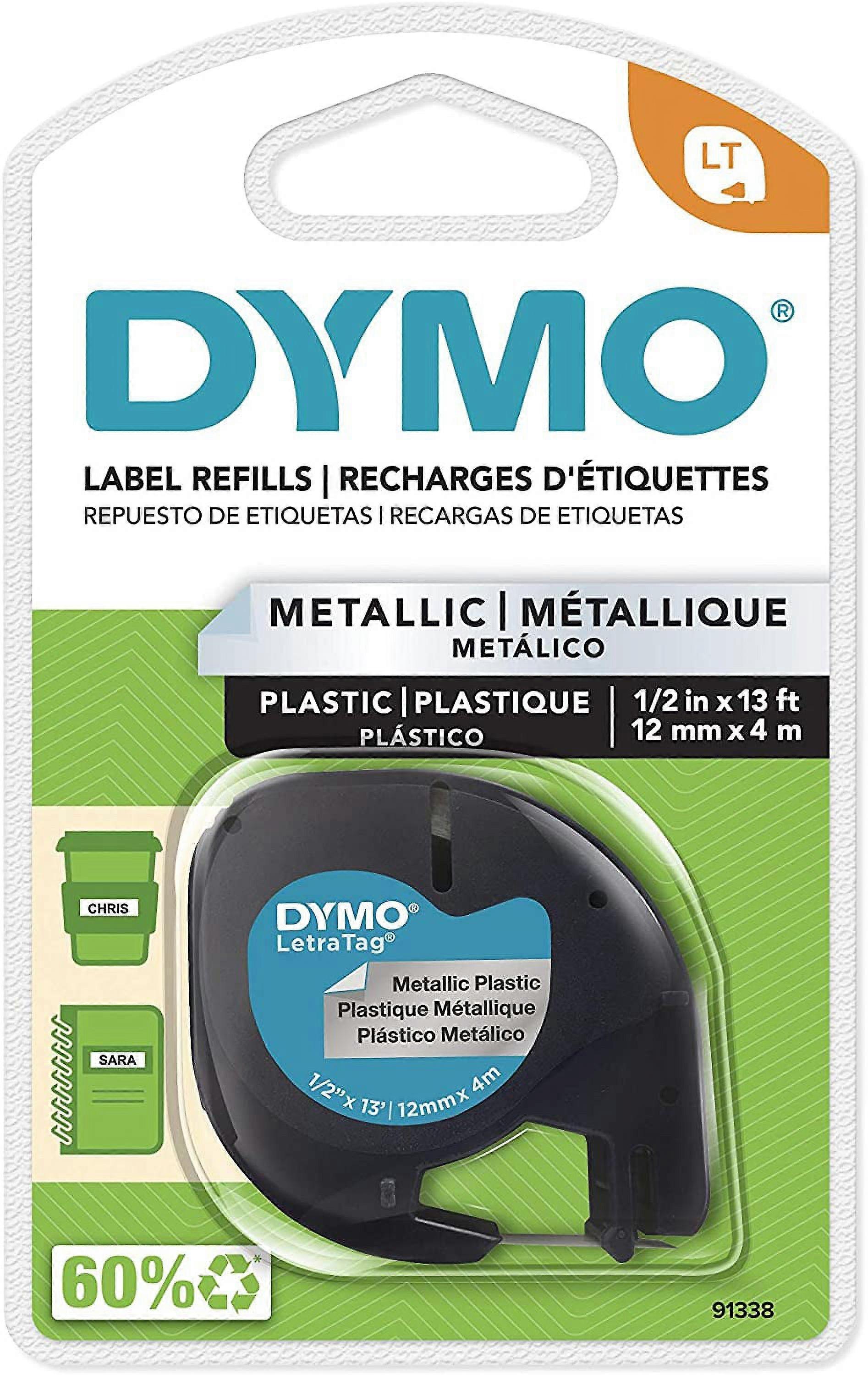 LT Plastic Labels for LetraTag Label Makers, Black Print on Metallic Silver Tape Labels, 1/2-Inch x 13-Foot Roll