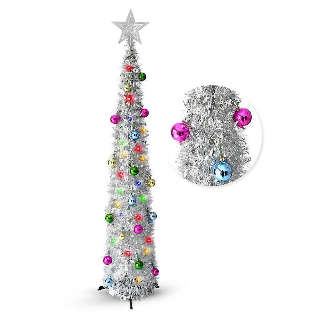 5FT Collapsible Artificial Christmas Tree with 50 LED Lights, Silver Tinsel Xmas Decor for Indoor Outdoor Holiday Party, Compatible with Home