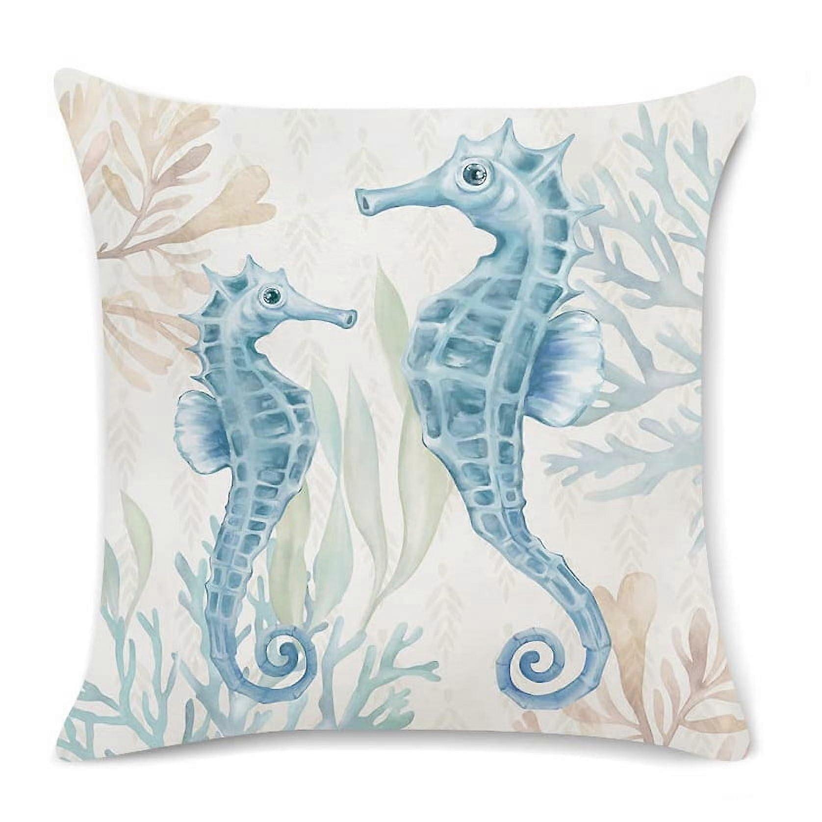 Ocean Beach Pillow Covers 18x18 in - Seahorse, Turtle, Starfish Coastal Decor, Soft Velvet Cushion Cases for Couch, Sofa, Bed
