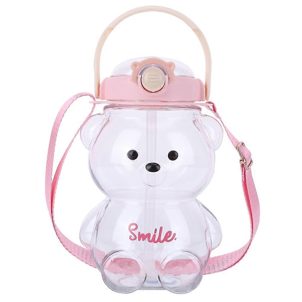 1000ml Bear Kawaii Water Bottle with Straw and Strap, Cute Water Bottles for Kids, Portable Leakproof BPA-free Drinking Cups, Pink