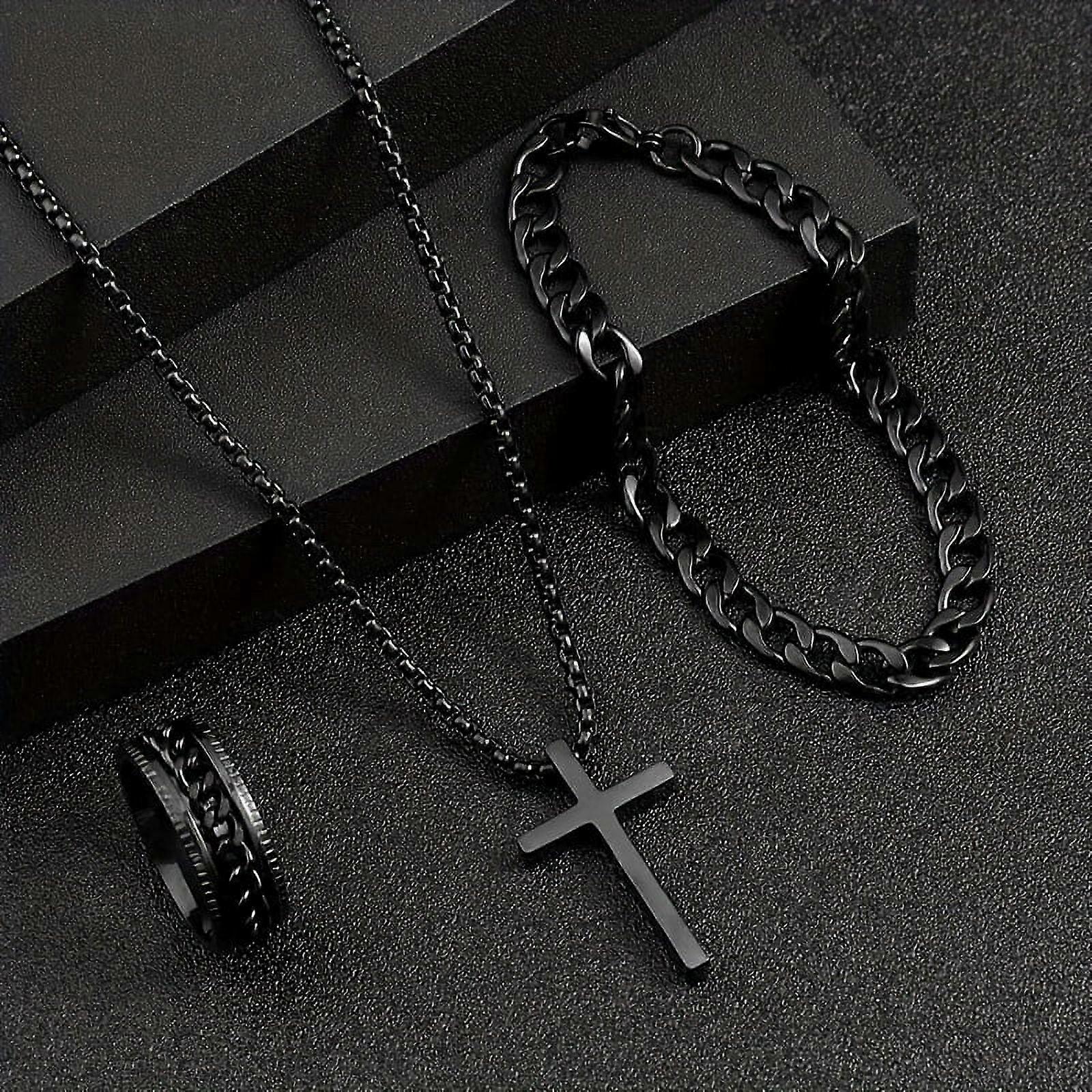 A Set of Men's Stylish and Versatile Stainless Steel Jewelry Set, Black Cross Necklace, Bracelet and Ring