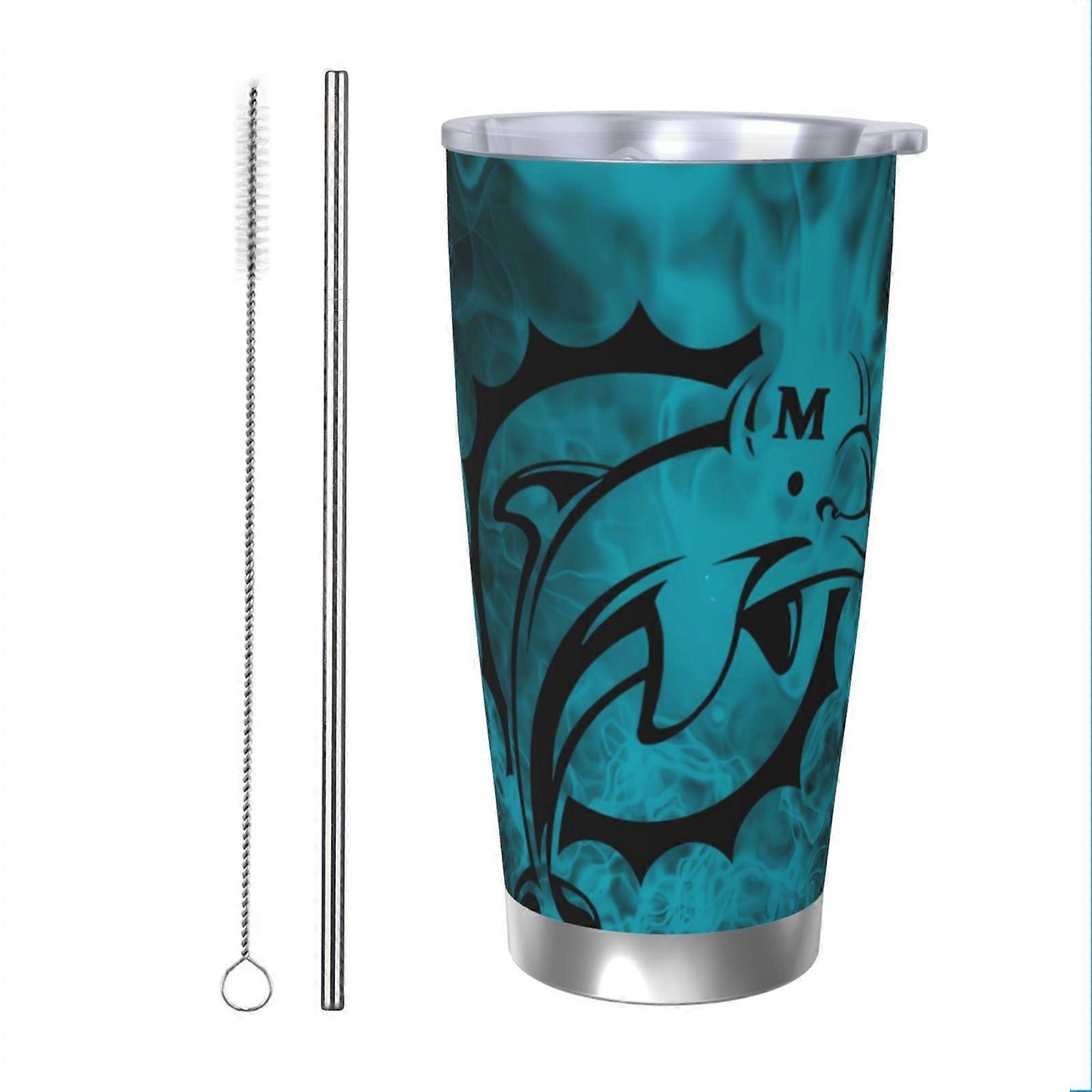 Dolphins Football Team Theme 304 Stainless Steel Thermos Cup 20oz with Lid & Straw, Compatible with Car Cup Holder, Hot & Cold Drinks