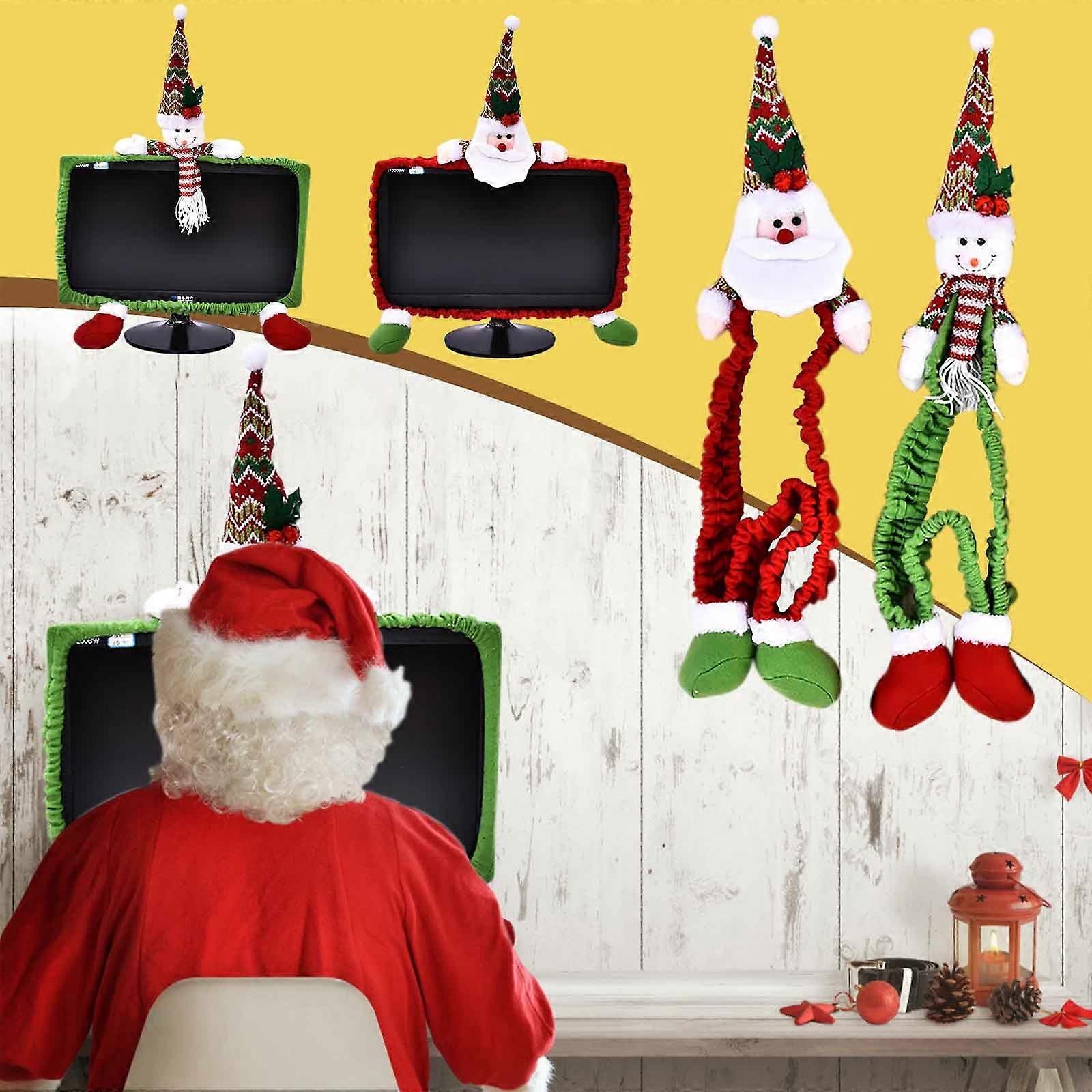 Christmas Monitor Cover with Plush Cloth, Santa & Snowman Design, Elastic Dust Proof Cover Compatible with PC TV Laptop LCD Screen