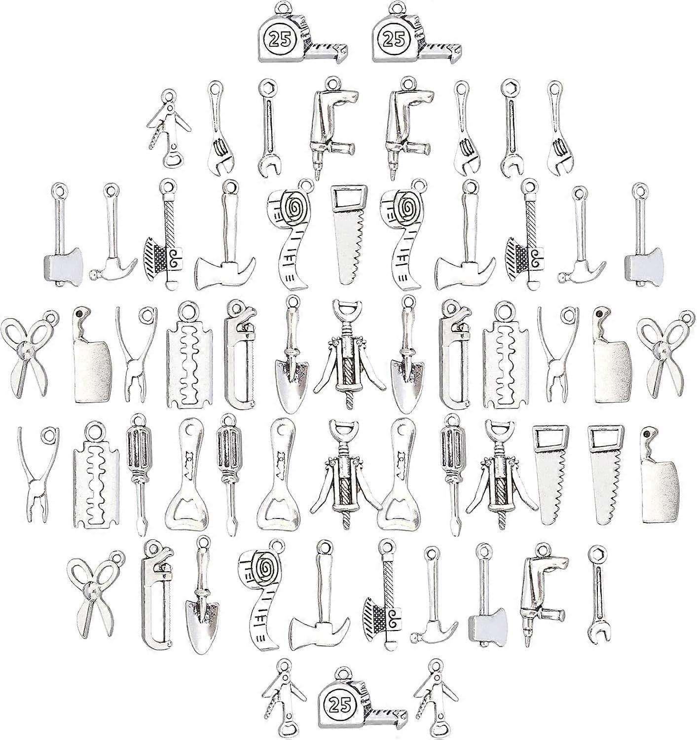 1 Box Home Tools Charms Alloy Pendants Tibetan Style Miniature Scissor Hammer Axe Bottle Opener Nail Drawer with Hole for Crafting Jewelry Making Accessory DIY Antique Silver DIY [HOME TOOLS THEME CHARMS]: 60Pcs alloy charms in multiple shapes of scissor, hammer, axe, bottle, opener, nail drawer, etc, 20 kinds of cute tiny tools pendants allows you to design unique handicrafts of your own art style. [1 BOX 60PCS]: 60Pcs antique silver alloy charms in 20 styles, each style 3pcs, the largest size is 17x23x3.5mm (tape charm), hole: 3mm; the smallest size is 25x11x1mm (blade charm), hole: 1.6mm; all storage in a plastic box: 7.4x7.2x1.7cm. [HIGH QUALITY MATERIAL]: Those home tools charms are made of alloy with high quality, of great antiqued silver shine, sturdy enough while beautifully looking, not easy to wear and tear, hard to change color or deform. [MULTIPLE USE]: Silver alloy charms can be combine earring hooks, jump rings, chains or rings to make unique earrings, bracelets or other jewelry crafts, according to your preference. [SWEET GIFTS]: You can make a bracelet with home tools charms and give to your art-love friend, great gift choice for reunion, Christmas, New Year, or his/ her birthday.