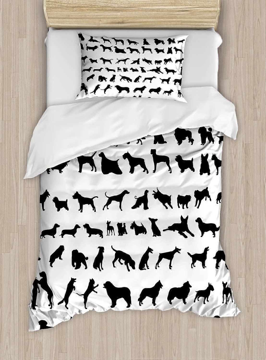 Dog Lover Duvet Cover, Silhouettes of Different Breeds: Chow Chow, Shepherd, Pinscher, Spaniel, 3 Pcs Set with 2 Pillowcases, Black White