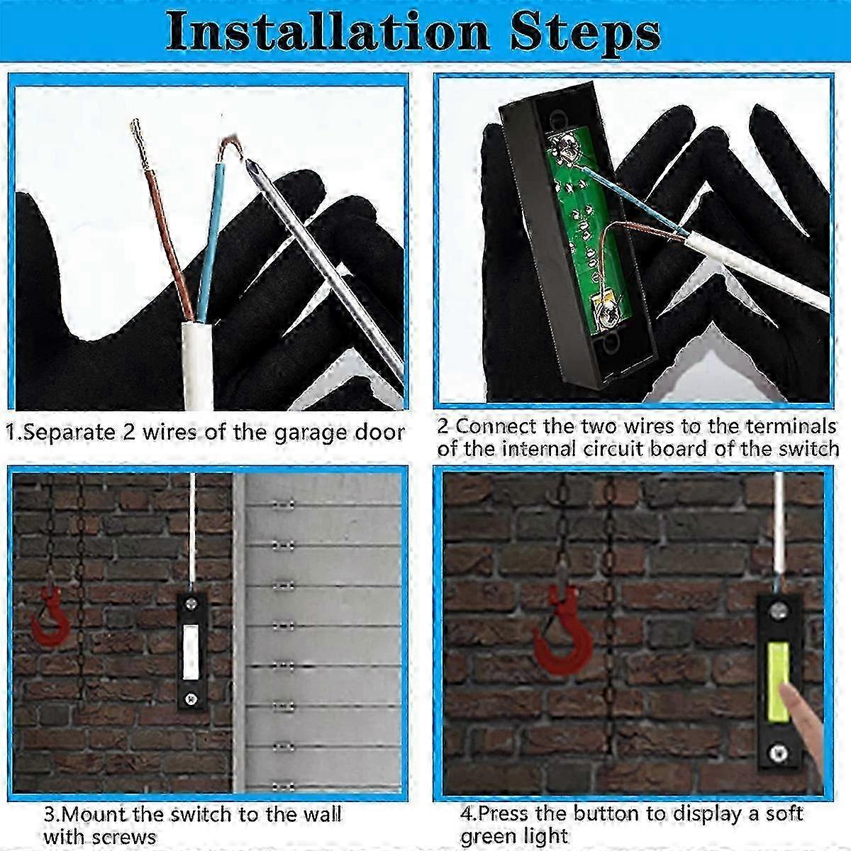[Soft green lighted wall button]-The shell is made of black plastic, with a white center strip appearance. It can be turned on/off with a single tap, and it lights up in soft green. Whether it is white or green, it is easy to find in the dark, which provides convenience for opening and closing the garage. [Compatibility]-This wall-mounted garage door bell door opener is a good substitute for your garage door opener switch and is compatible with Liftmaster 75LM remote control. [Easy Installation]-First, separate the two wires of the garage door, connect the two wires to the terminals of the internal circuit board, and then install the button switch to the wall with screws. After finishing, press the button to display a soft green light. Note: there are no wires included with the push button size: 7.2 x 1.8 x 1.8cm Material:plastic colour:Black Package Contents: 2 x Wired garage door opener buttons 4 x Screws Only the above package content, other products are not included. Note: Light reflection and different displays may cause the color of the item in the picture a little different from the real thing. The measurement allowed error is +/- 1-3cm.