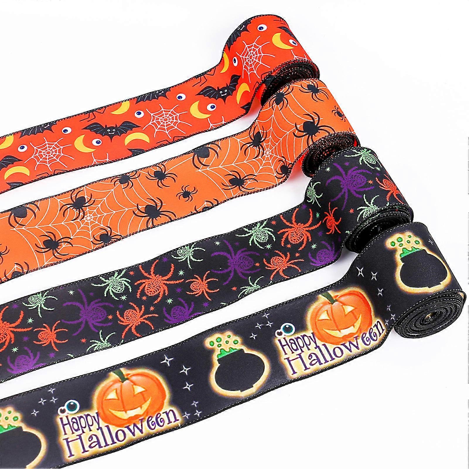 SUSUchens Halloween Wired Edge Ribbon Bat Spider Pumpkin Ribbon Halloween Wrapping Ribbon for DIY Craft Floral Bow Purple