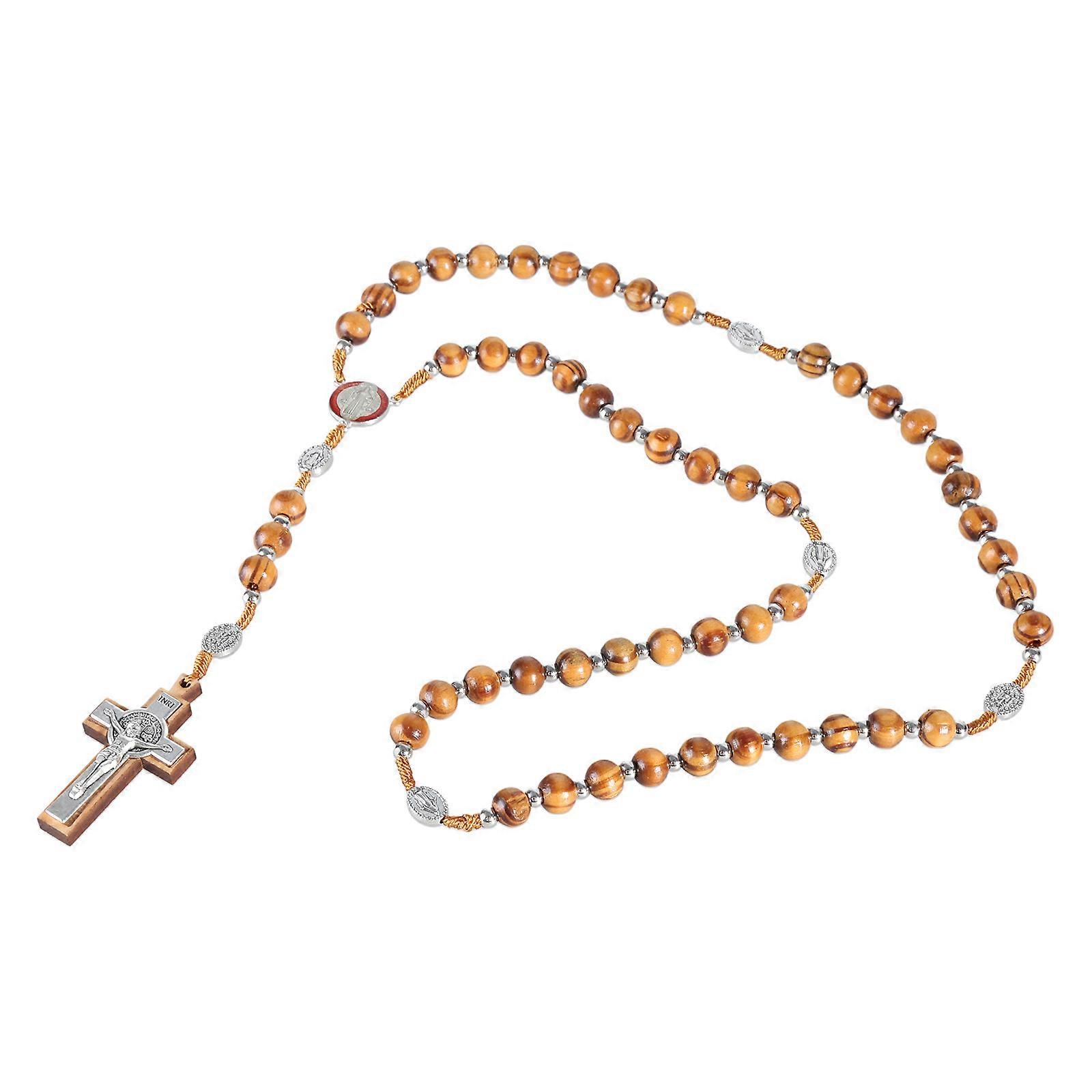 Rosary Necklace with Jesus Crucifix Catholic Cross Pendant Wooden Beads Long Chain Necklaces Jewelry Gift for Men Women Multicolor