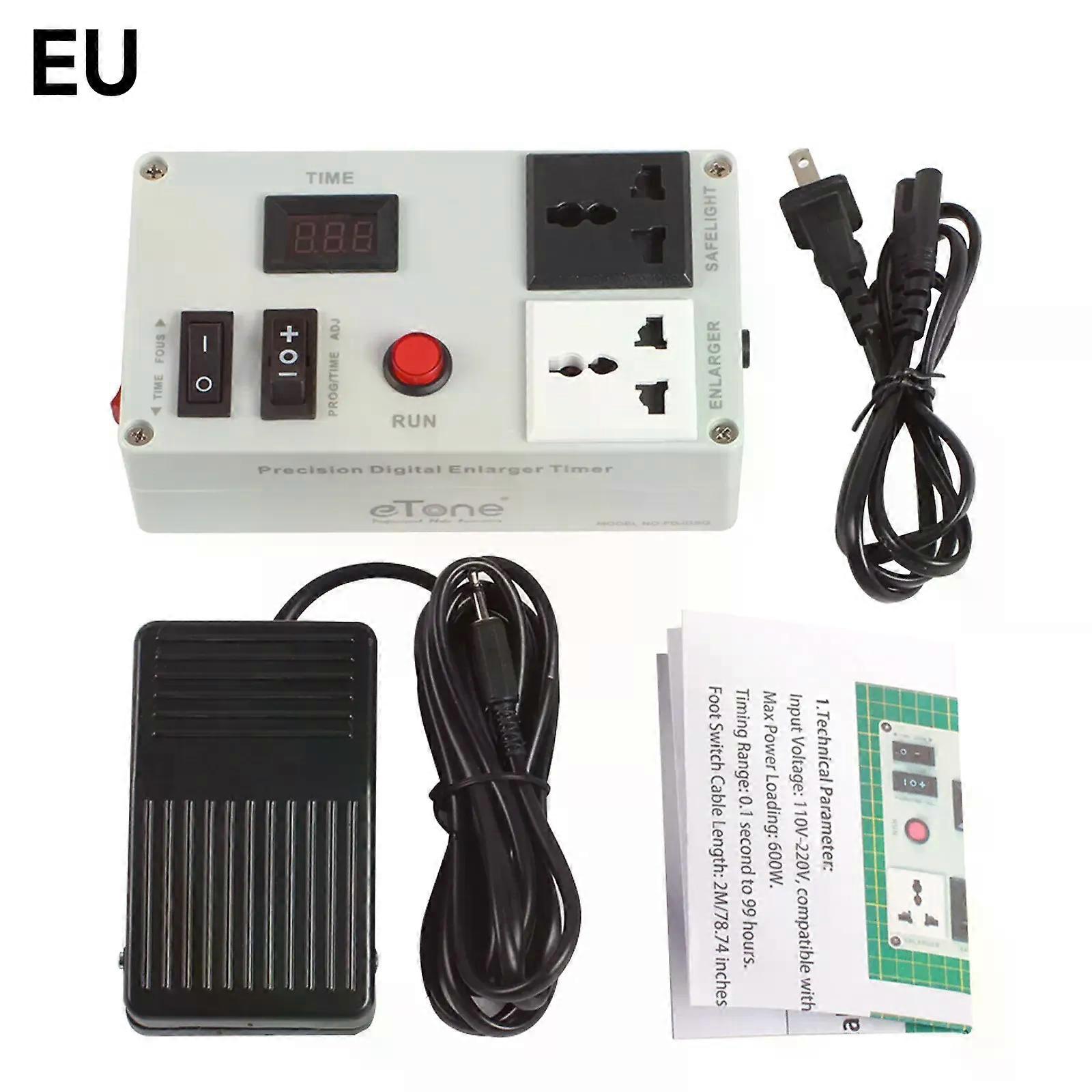 eTone Digital Enlarger Timer Precision With Foot Switch Darkroom Photo Equipment High quality Photographic supplies eTone Precision Digital Enlarger Timer for Foot Switch Darkroom Photo Printing Enlargement Exposure Box Equipment 1. Technical Parameter: Input Voltage: 110V-220V, compatible with different enlarger. Max Power Loading: 600W. Timing Range: 0.1 second to 99 hours. Foot Switch Cable Length: 2M/78.74 inches 2. Time program setting code as the following: P00: 1-999 seconds. P01: 1-999 minutes. P02: 1-99 hours. P03: 0.1-99.9 seconds. Note: Program P03 will not present decimal point, e.g. 105 refers to 10.5 seconds. 3. More Information: 1. When power on, enlarger light up, until time setting done and time up, enlarger lights out and darkroom safelight up. 2. "RUN" button can be replaced by foot switch. 3."TIME/FOCUS"button:"|"for"ENLARGER"lightup(darkroomenlargerfocusadjustmentoperating)."o"for"SAFELIGHT"lightup(whenlayoutphotographicpaperunderthefocusedlens). Package included: 1x enlarger timer 1x power cable 1x foot switch 1x EN instruction 1x plug converter Note: plug converter will be sent by buyer's country standard. Where using US and UK plug standard will not come with converter. For darkroom safe light, please check my store. PLEASE NOTEWE WILL SEND UPGRADE VERSION AS FOLLOWING PICTURE SHOWN: _x000D_