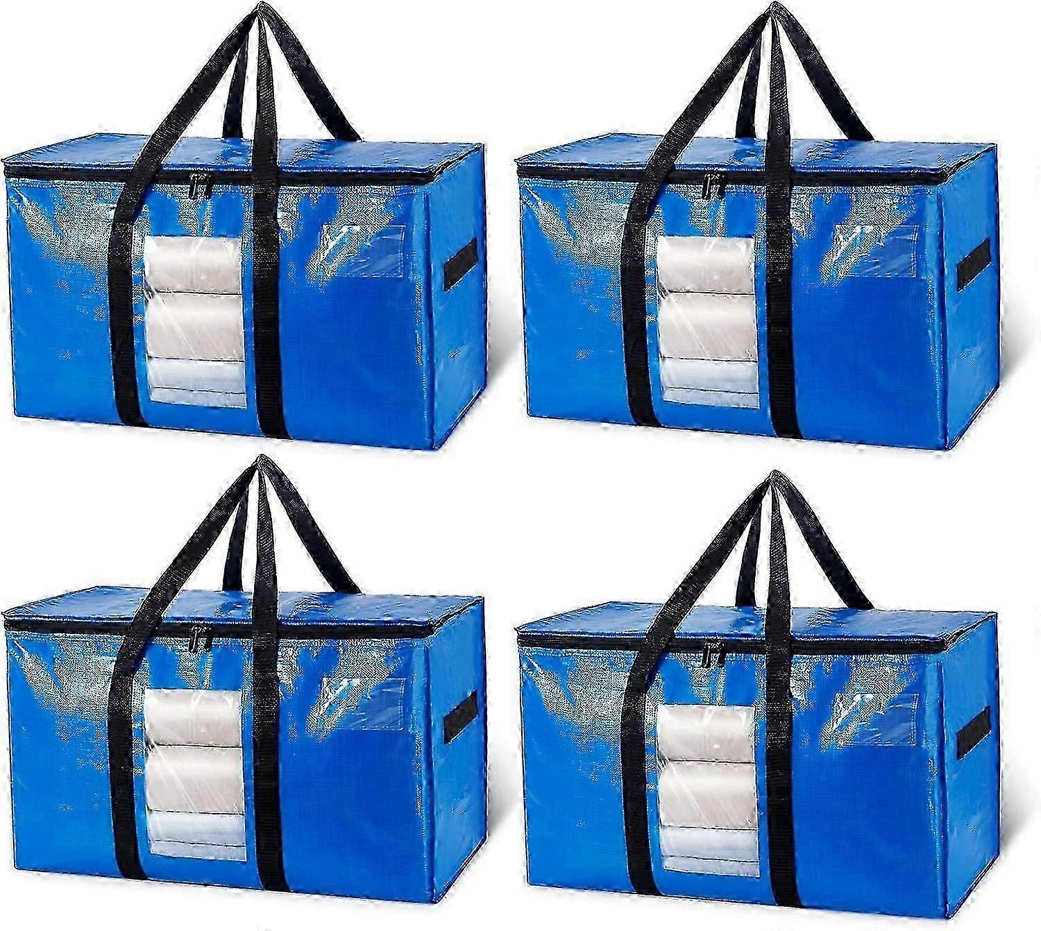 Usage Tips:Extra Large Size: 4 Pack heavy duty moving bags (70*42*35 cm), each jumbo storage bags with zips holds 100 litres, provides enough space for all the items you want to transport or store, Perfect for storing seasonal clothes, bedding, blankets, Pillows, quilts,toys, duvets,Christmas decorations, etc Multi-purpose: Moving bags extra large strong can be used to store items in wardrobes,attics,basements,bedrooms,under bed storage,dormitory,loft storage and laundry rooms. These bag clothes storage are waterproof and there is no need to worry about getting dirty. storage bags making them perfect for moving,camping,shopping,travel ext Ideal Organiser: Our jumbo storage bag with zips come with a handle, zip and lid. You can easily carry our extra large moving bag over your shoulder, making it easy to transport. such as carrying groceries from the supermarket camping or travelling. packing bags are perfect for travelers,homeowners,college student,moving,underbed storage Easy to Use: The moving bags is equipped with a three-sided wrap-around zip that helps you open the bag completely and is wide enough to fit items into the bag easily. When not in use the under bed clothes storage can be folded away without worrying about taking up space, making it the perfect replacement for big moving boxes and moving crates Durable and Heavy Duty: The clothes storage bags uses a 3-layer stitching technique to handle the zip, long carry handle and side straps, giving the main body of the bag plenty of carrying capacity and tear resistance. The U-shaped handle design wraps the blue heavy duty storage bag from the bottom to the side, increasing the bottom load capacity and allowing for easy storage of up to 100 lbs
