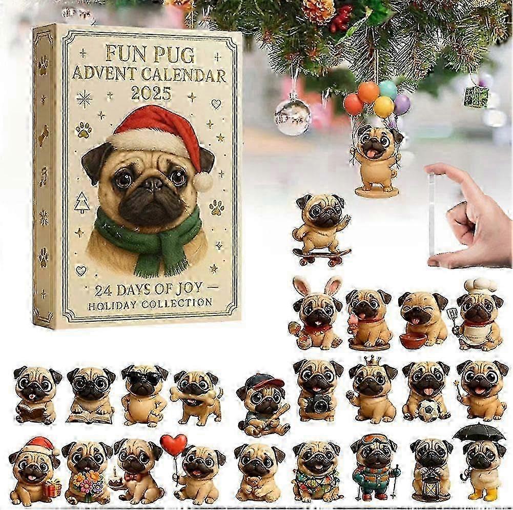 Quality Pug Advent Calendar 2025, 24 Days Christmas Countdown Calendar with Cute 2D Acrylic Pug Dog Hanging Ornaments, Christmas Tree Decorations, Hol
