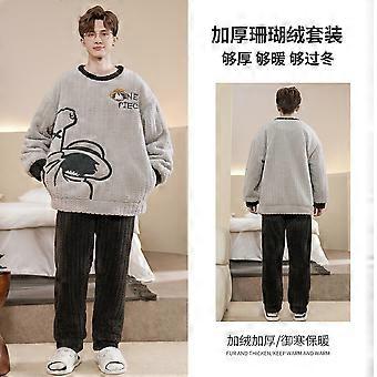 Coral Fleece Pajamas Men's Autumn and Winter Plush Thickened Teenager Student Cartoon Long Sleeve Round Neck Home Clothes Set