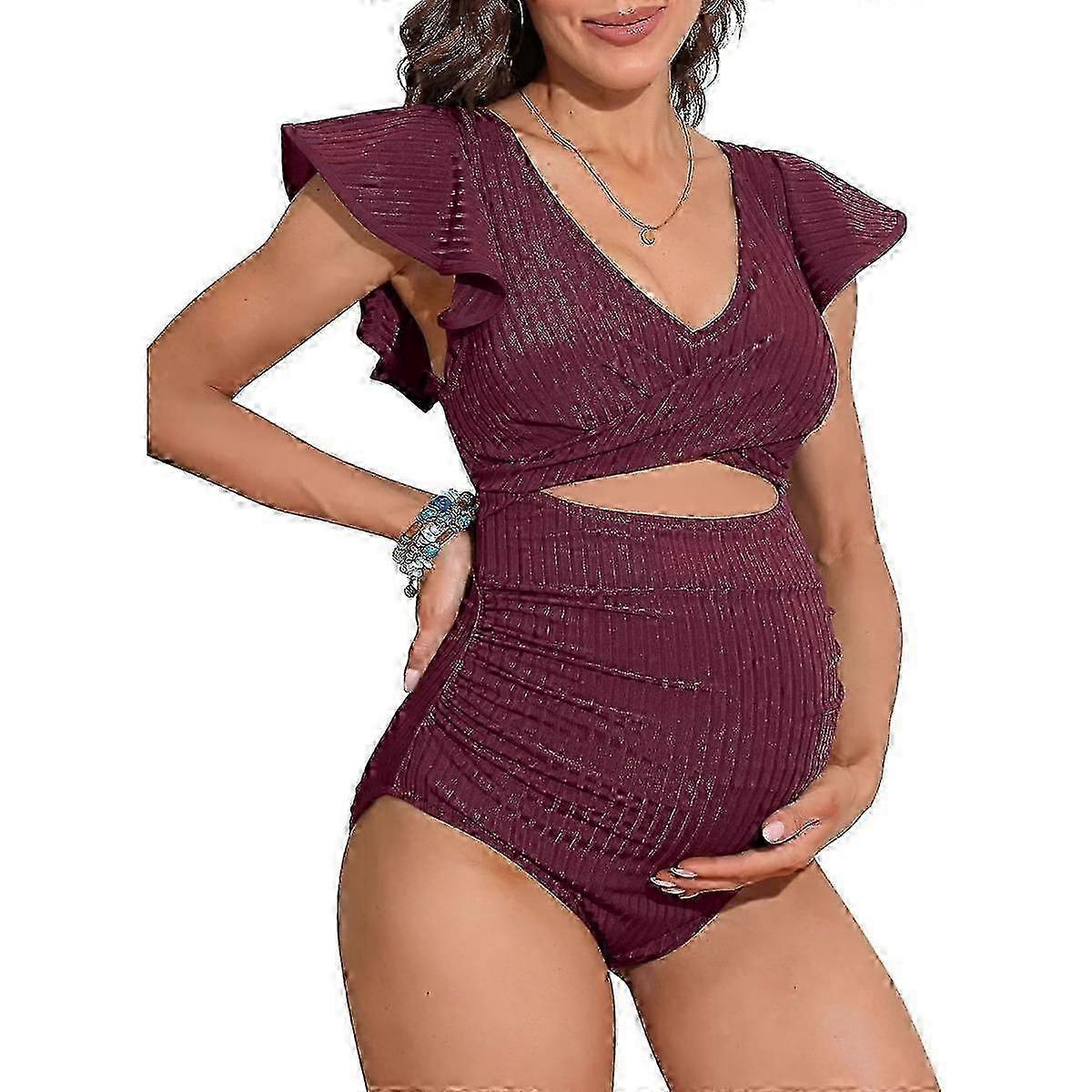 Charmleaks Maternity Swimwear: Ribbed One-Piece with Ruffle Sleeve & Ruched Cut-Out Design
