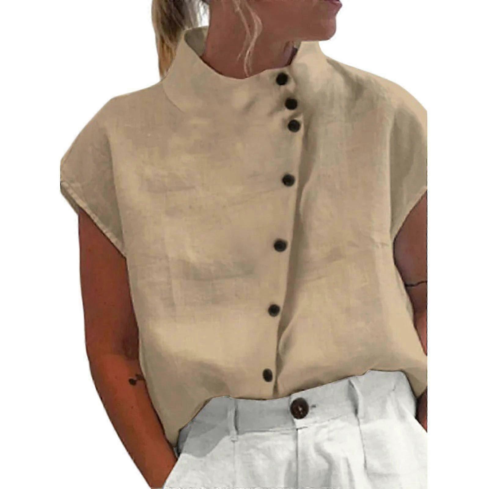 Women's Light Blue Loose-Fit Button-Down Blouse with Short Sleeves and Stand Collar - Cotton Linen XXL