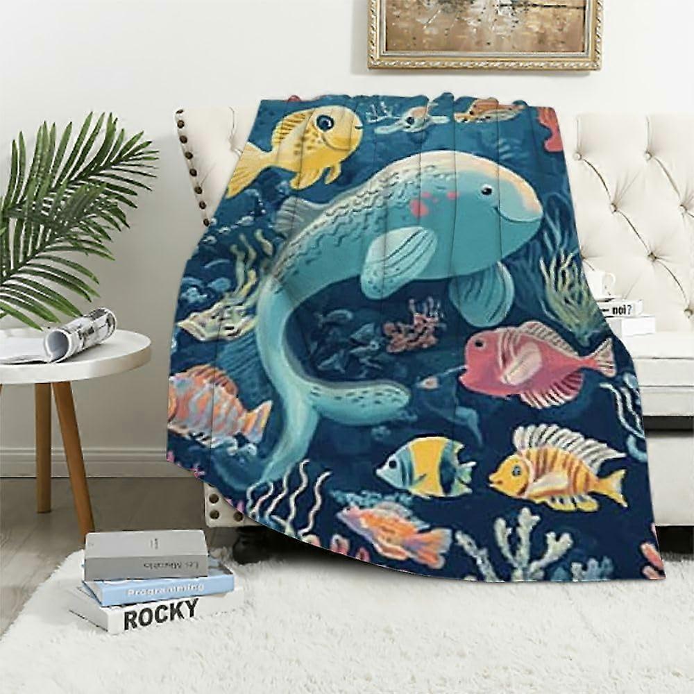 Cute Blue Sea Creatures Octopus Whale Flannel Blanket 50x60in - Soft Warm Throw for Kids, Bed, Couch, Sofa - Perfect Autumn Winter Gift