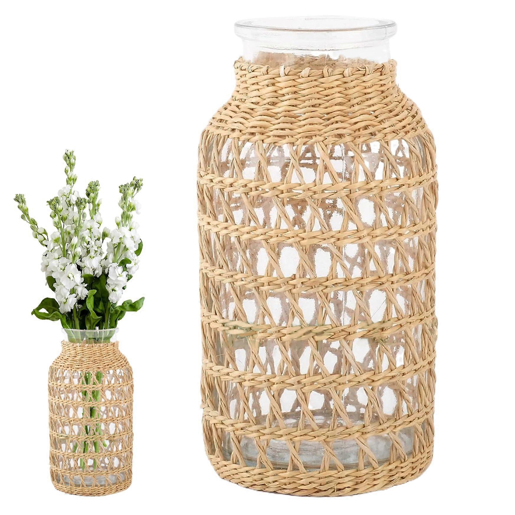 Glass Flower Vase With Clear Woven Cover And Rattan Cover Boho Farmhouse Table Centerpiece