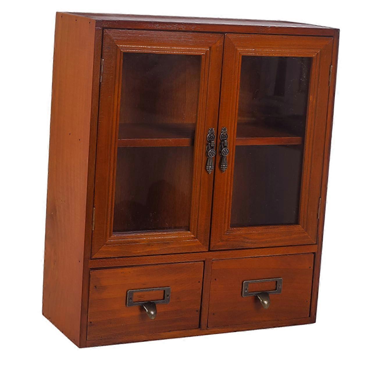 Vintage Wooden Display Cabinet For Desktop Storage And Organization, Antique Finish, Holds Stationery Cosmetics Jewelry