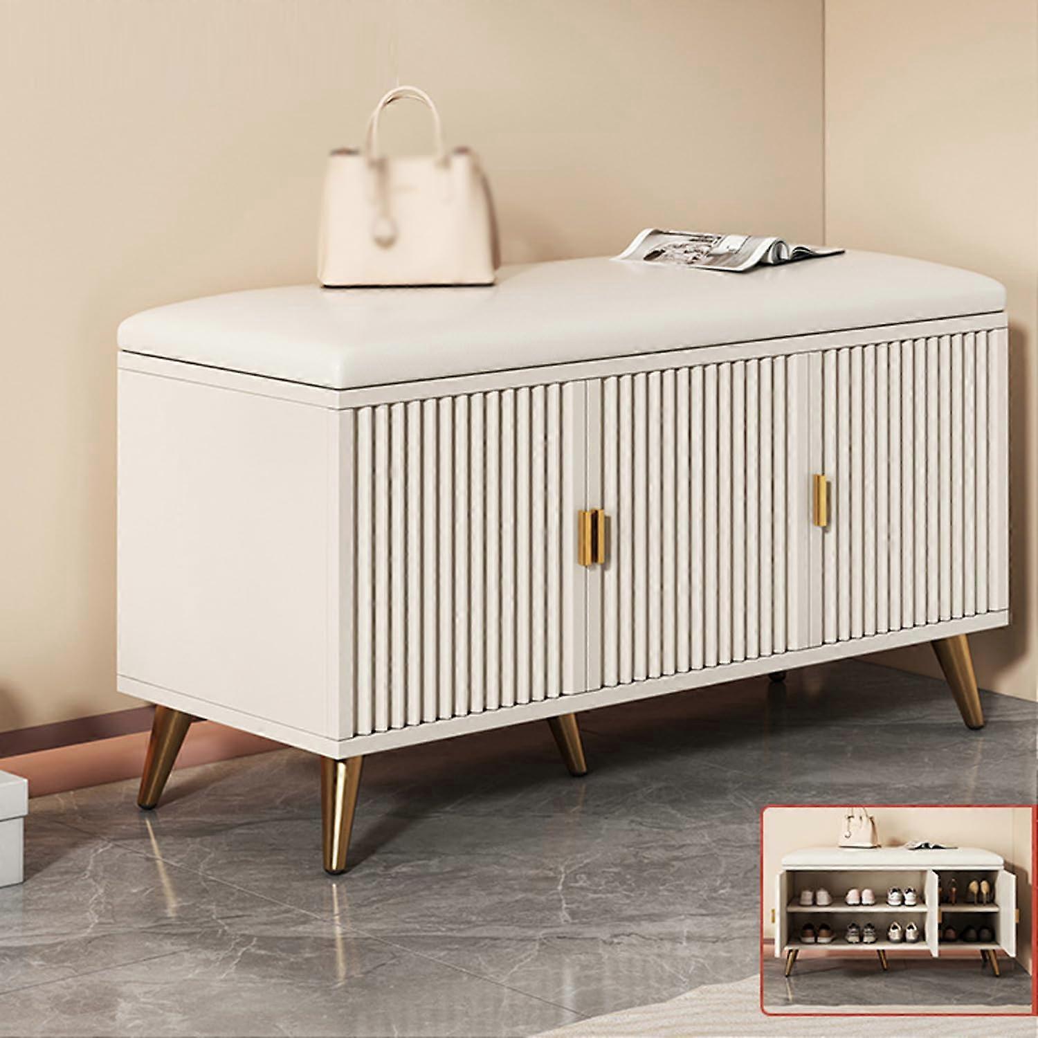 Shoe Rack Bench Wooden Entryway Storage With Door Padded Cushion White Gold 90x30x50cm