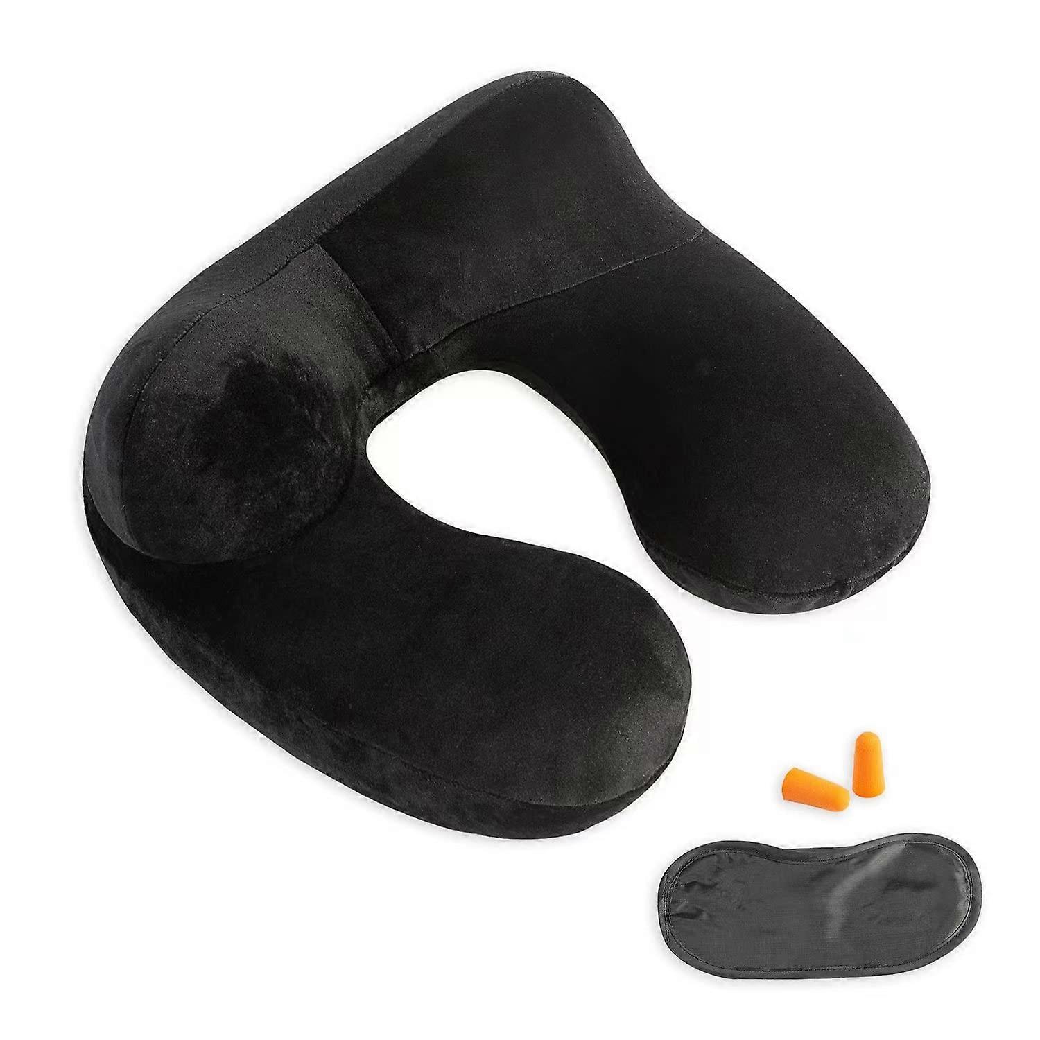 Inflatable Travel Pillow Neck Support For Travel Airplanes Cars Velvet Washable Cover Compact Carrying Bag Black