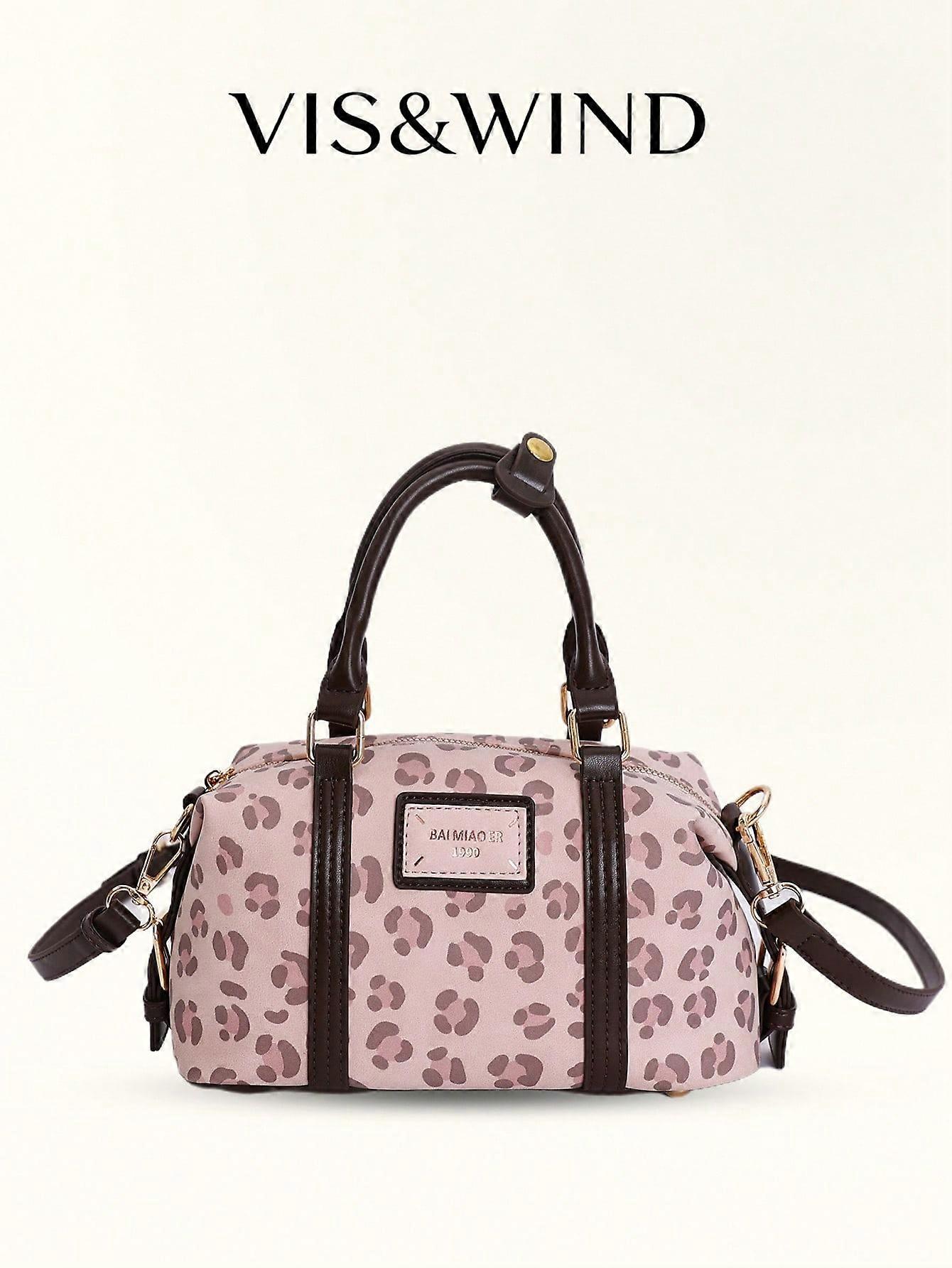 1pc Autumn/Winter Contrast Color PU Leather Handbag, Women's Casual Retro Fashion Versatile Leopard Print Bowling Bag, Dual Handle Design, Zipper Clos