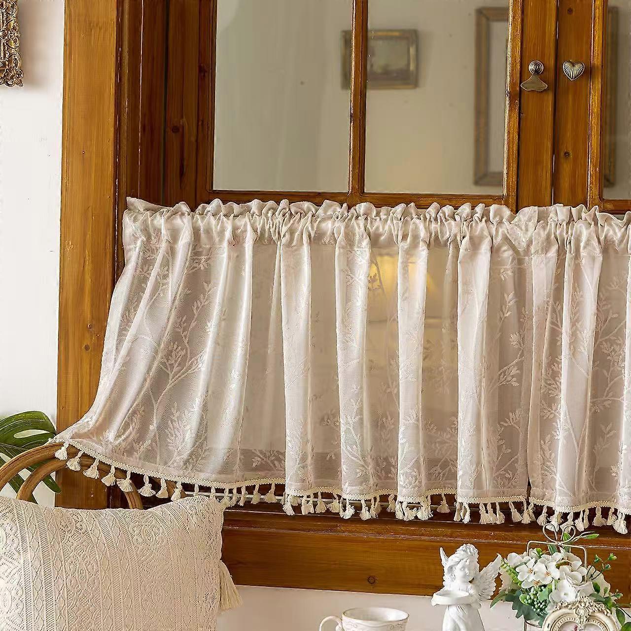 Beige Valances For Windows, Small Window Curtains For Living Room Bathroom Laundry Basement, Modern Rod Pocket Semi Sheer Jacquard Curtains
