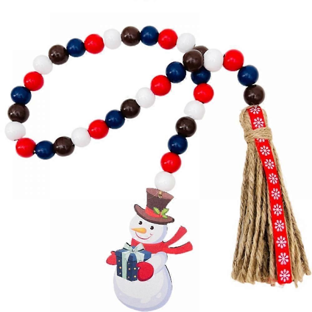 Christmas Wooden Bead Wreath with Tassels & Snowman Pendant, Farmhouse Wall Hanging Garland for Tree Decor