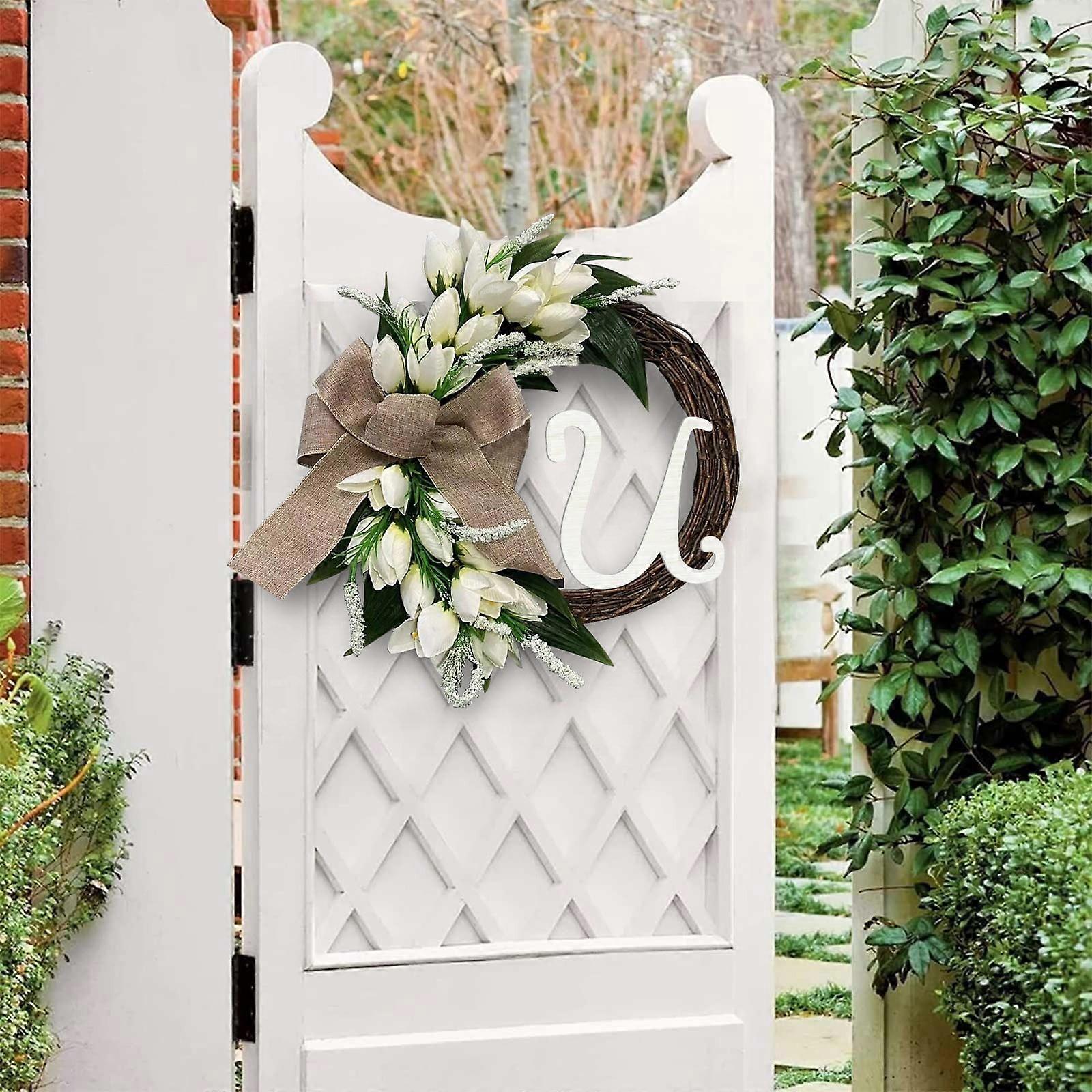 Winysin Mother's Day White Wreath with A~Z Letter Surname, Natural Grape Vine Door Wreath, Farmhouse Front Door Decor, Spring Outdoor Hanger