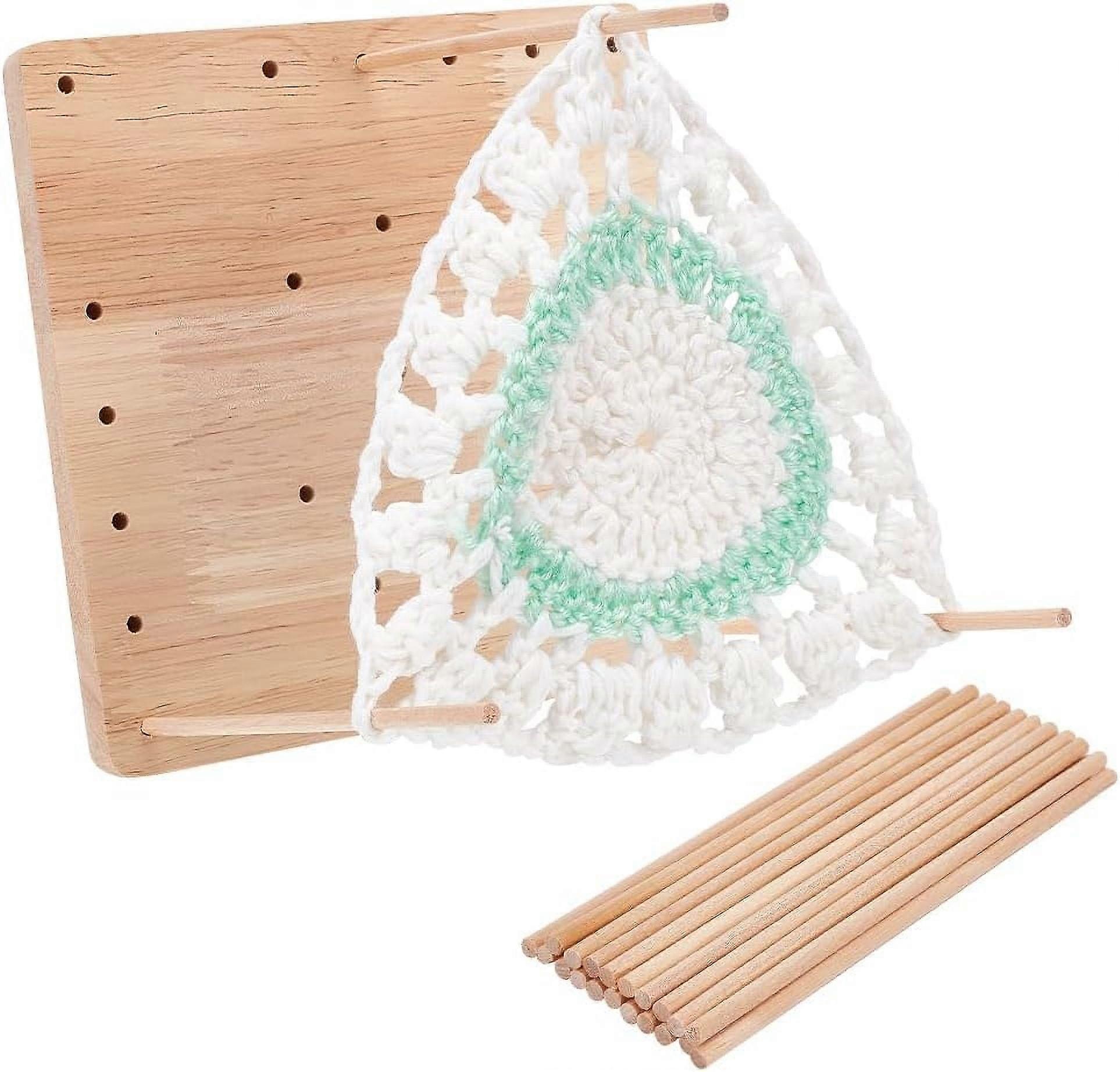 DIY 6.3x6.3x0.47inch Handmade Wooden Blocking Board with 20pcs 5.9x0.16inch Round Wooden Sticks Square Knitting Loom for Knitting Crochet and Granny Squares DIY [Package Includes]: 1 piece square handmade wooden block board with 20 round wooden sticks with square and triangle hole design for handmade. [Size Reference]: Square pattern wooden crochet board: about 16x16x1.2cm/6.3x6.3x0.47inch, 1 piece; round wooden sticks: about 150x4mm, 20 sticks. [Material]: The blocking board is made of high quality wood, perfect for beginners. A blocking board can make your knitting more professional. [For Knitting]: It is a good choice for knitting enthusiasts, moms and grannies. Great for blocking granny squares. Ideal for small blocking projects. [Sturdy and Durable]: Our wooden blocking board is designed to last a long time and will not loosen or get damaged by repeated use.