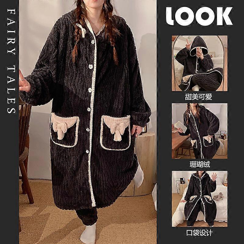 Pajamas women autumn and winter coral fleece long robe suit with hood thickened small fragrance style can be worn outside home clothes winte