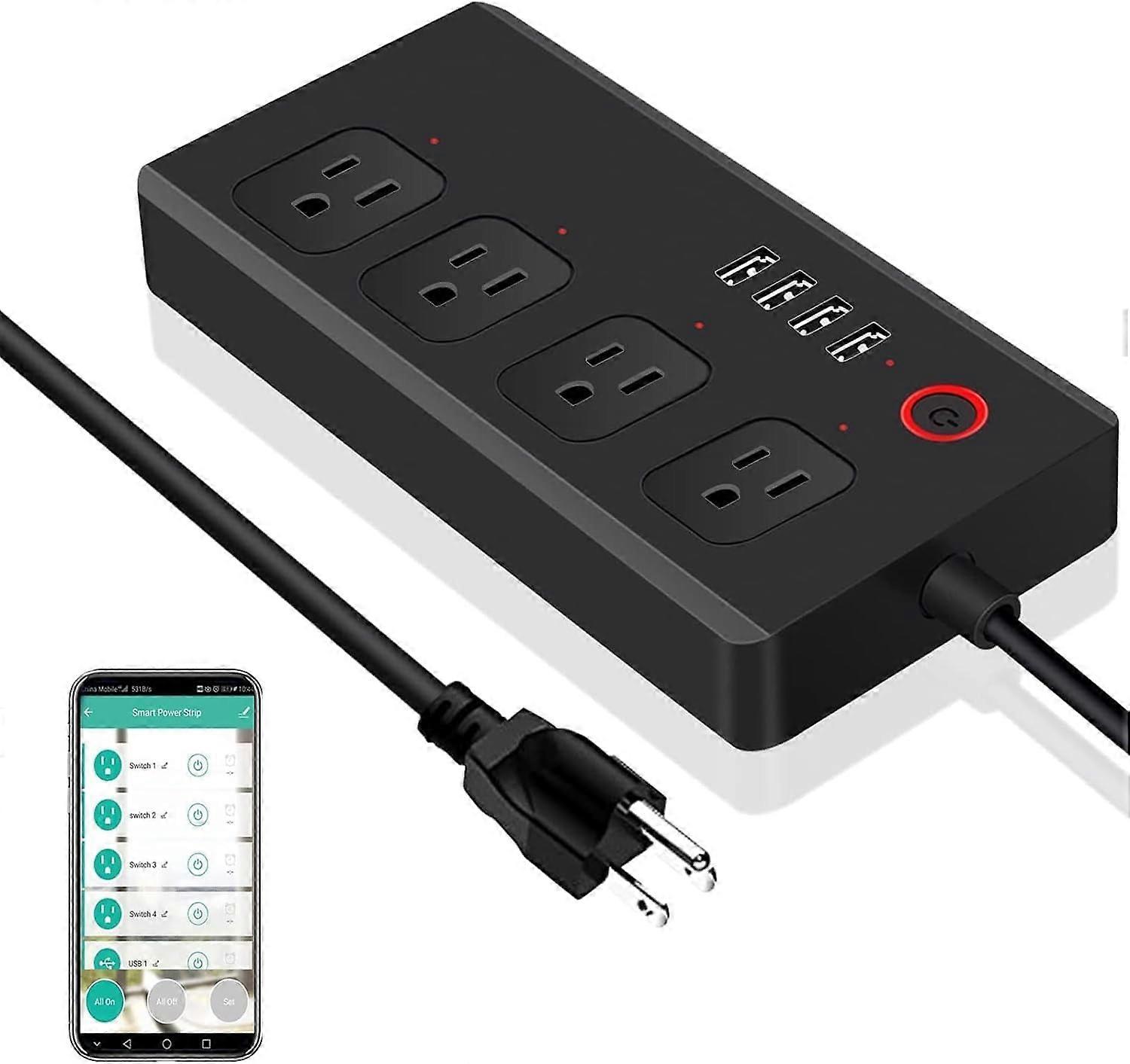 About this item ⭐ 4 AC outlets 4 USB ports - Smart power strip with 4 Individually Controlled AC outlets and 4 USB ports supported for 8 appliances simultaneously(NOTE: the 4 Outlet can be controlled individual;4 USB ports are controlled as one unit). Surge protectors protect sensitive electronic equipment and electrical appliances from the effects of surges. It is very suitable for charging devices in homes, offices, hotels and travel, as well as as a gift. ⭐ Hands-Free Voice Control Simple voice commands allow you to control your power strip on/off when your hands are busy, and enjoy the convenience of voice hands-free. Works with Alexa, Google Assistant. Only Support 2.4GHz Wi-Fi network. ⭐ Control from anywhere Forgot to turn off the power strip? Don't worry! With just a smartphone, you can not only turn off the power when you leave home, but also turn it on before returning home. Control your power strip anytime, anywhere. ⭐ Set Schedules and Timer Create a custom schedule to automatically turn on and off any electronic devices or electrical appliances, such as computers, mobile phones, Christmas trees, coffee machines, lights, and electric fans, as needed. Energy saving means saving money. ⭐ Safe & Install FCC/ETL Certified. Equipped with PC flame-retardant housing. Support overload and overheat protection. Just 3 steps: insert, download Smart app, add equipment. If you encounter any product problem or need further support, please feel free to contact us via email or , if it is defective, we will provide a free replacement service at any time with, a two-year warranty. Smart Power Strip - Surge Protector with 4 Individually Controlled AC outlets and 4 USB Ports,Compatible with Alexa and Google Home,5ft Extension Cord,No Hub Required,ETL Listed,10A Electronics › Accessories & Supplies › Power Strips & Surge Protectors › Power Strips Electronics › Accessories & Supplies › Power Strips & Surge Protectors › Power Strips Electronics › Accessories & Supplies › Power Strips & Surge Protectors › Power Strips Electronics › Accessories & Supplies › Power Strips & Surge Protectors › Power Strips