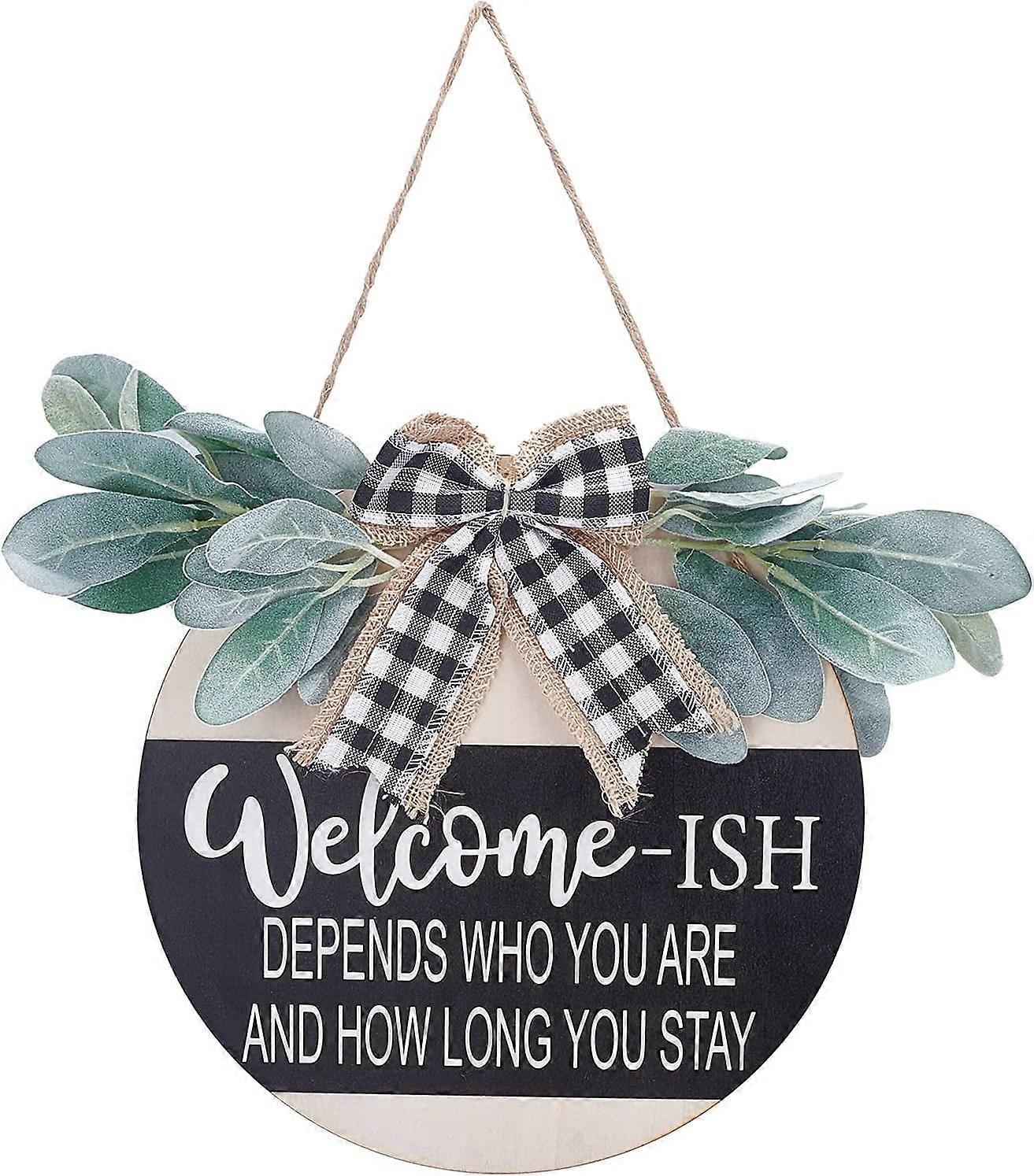 Welcome-ISH Bowknot Welcome Sign, Retro Wooden Round Plaque, Rustic Wall Decor for Home Farmhouse Front Door, Outdoor Black 11.8x11.8inch