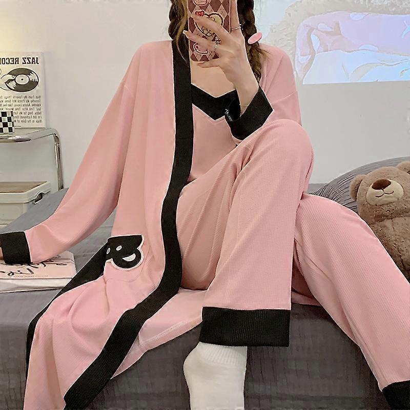 Pajamas women's spring and autumn new waffle long-sleeved nightgown suspenders pure desire style sexy three-piece home clothes