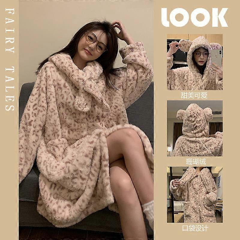 Autumn and winter pajamas women's coral fleece thickened plus velvet cute ins new leopard print nightgown winter home clothes