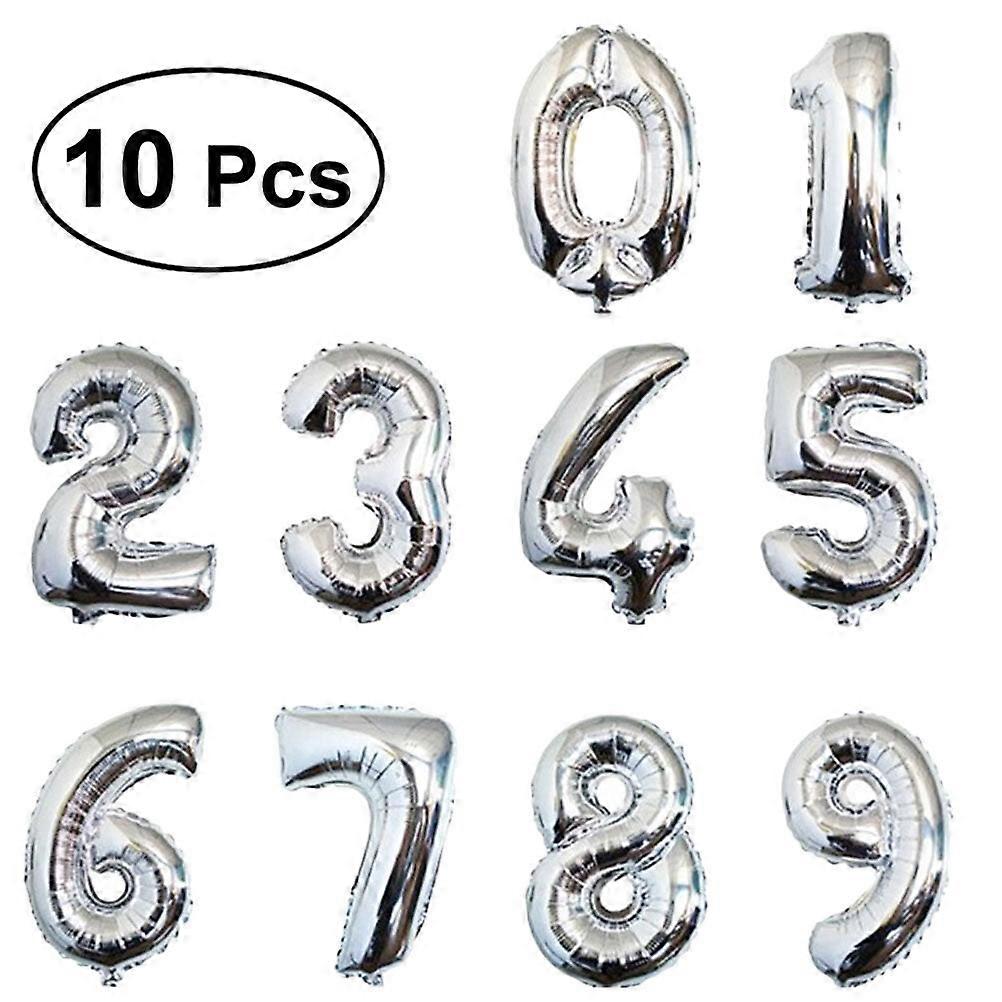 10pcs 0-9 16 Inch Digital Number Balloons Aluminum Foil Film Balloons Mylar Balloons Party Supplies (Silver)